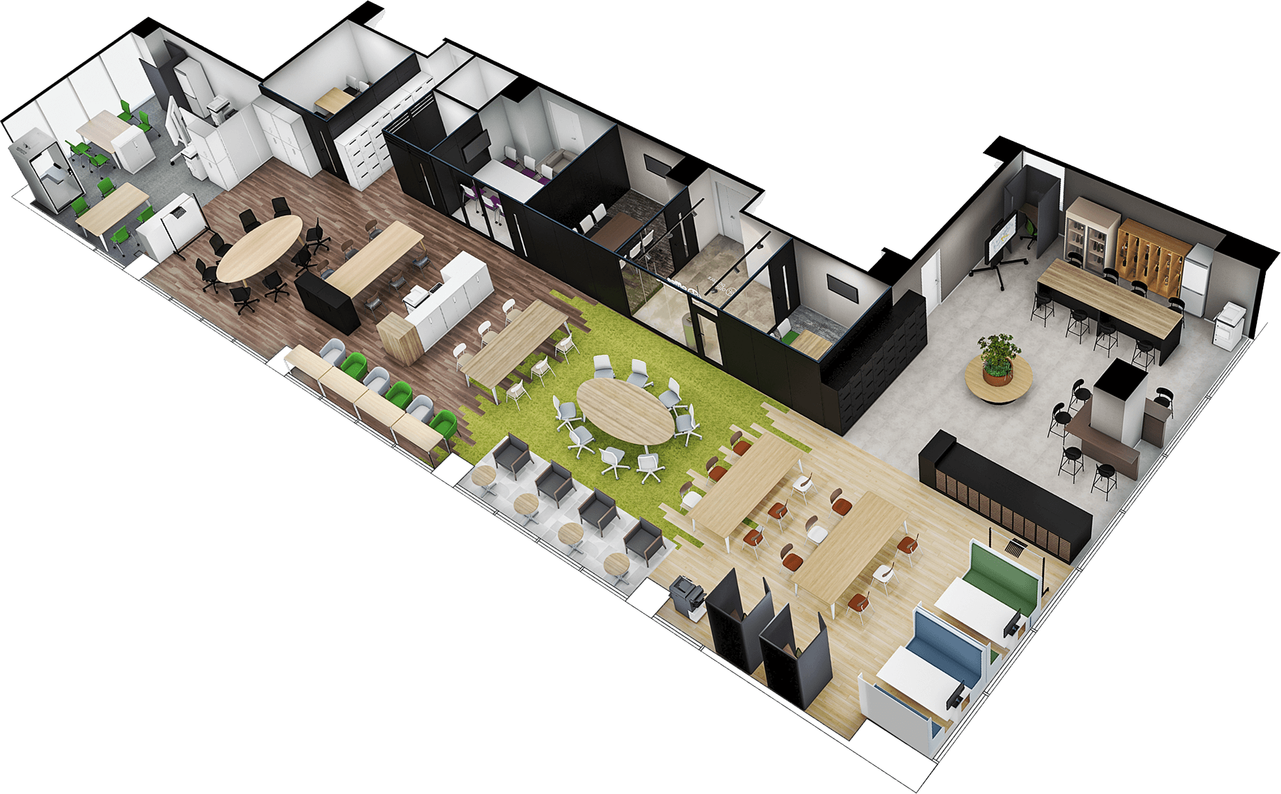 ミーティングスペースにやぐらを採用。壁の造作工事や電源工事を減らし、拡張性のあるオフィスレイアウトを実現。次の移転時にもそのまま再利用が可能です。