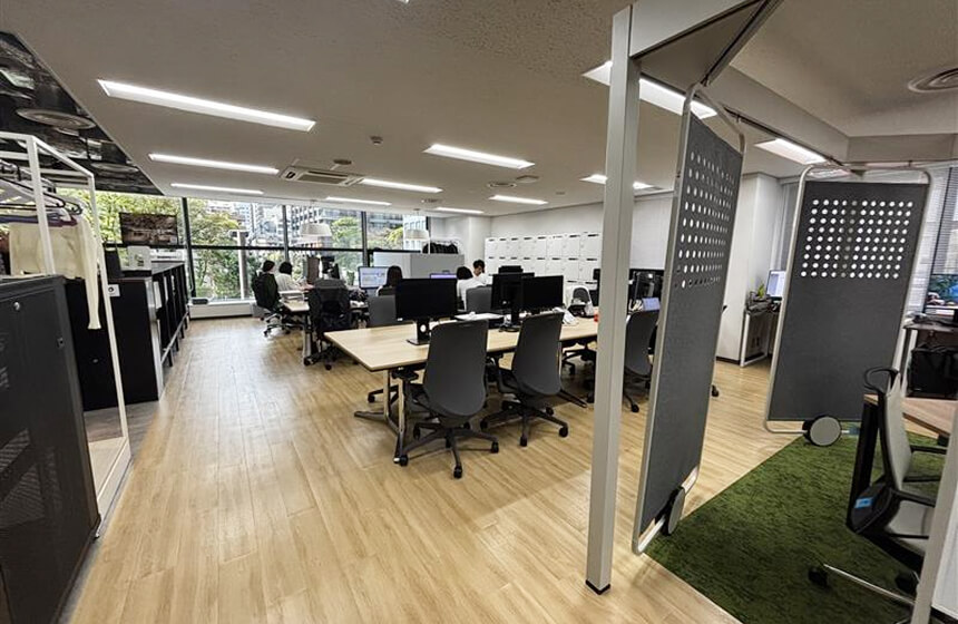 ミーティングスペースにやぐらを採用。壁の造作工事や電源工事を減らし、拡張性のあるオフィスレイアウトを実現。次の移転時にもそのまま再利用が可能です。
