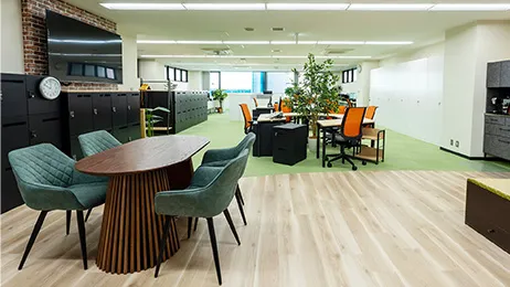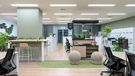 そこで、全面にフリーアドレスデスクを導入し、スッキリしたビジュアルにすることで圧迫感を軽減。さらに、植物(フェイクグリーンを含む)を視界入れることで、精神的ストレスを和らげ、リラックスを促して生産性を向上させる『グリーンアメニティ』の効果を取り入れ、デスクサイドや柱など随所に植栽・フェイクグリーンを配しました。空間の区分けにはパーテーションを極力使用せず、床のタイルマットを色分けすることでゾーニングし、開放的な雰囲気をつくりました。