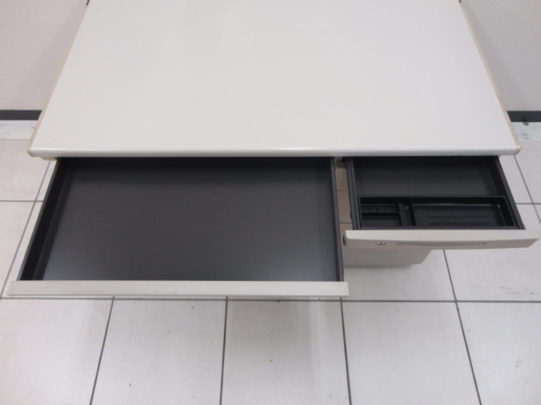 - 袖机のワゴンは、最下段がロング引出しになっており、従来より収納力120%アップ。