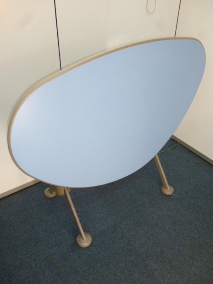 ブルーのお洒落なテーブル! 少人数でのミーティングや、待合室にも合う一品です。 スタック式ですので、使用しない時には天板を折りたためます。- 仙台店