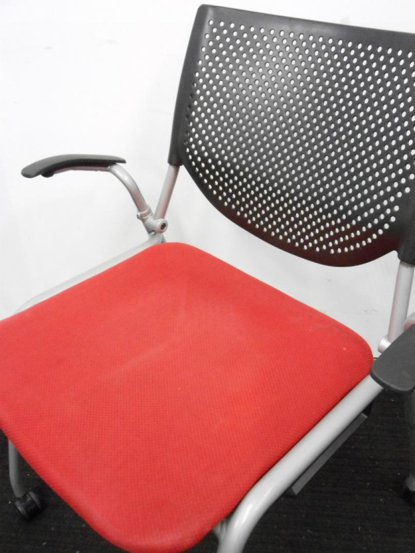【3脚入荷!】岡村製作所 肘付きキャスター付きスタッキングチェア レッド 会議用チェア ミーティングチェア 【中古オフィス家具 事務イス】サーキュラーバリューCO2削減量の算出について