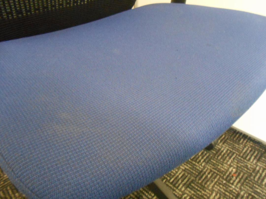 【人間工学に基づいた快適な座り心地!背によりかかるとバックシェルのグリッドが変形し、やさしくワーカーの身体を支えます!】■オカムラ(okamura)製 ヴィスコンテチェア (Visconte) 肘付きローバック ■固定肘 ■ミディアムブルー×ブラックシェル