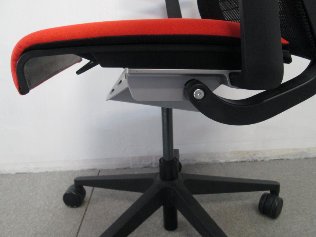 - レバーを引き上げながら座面を前後にスライドさせ、レバーを放すとロックします。背もたれに身体をつけた状態で膝の裏側と座面のエッジの間に5-8センチほどの隙間ができるのが理想的です。