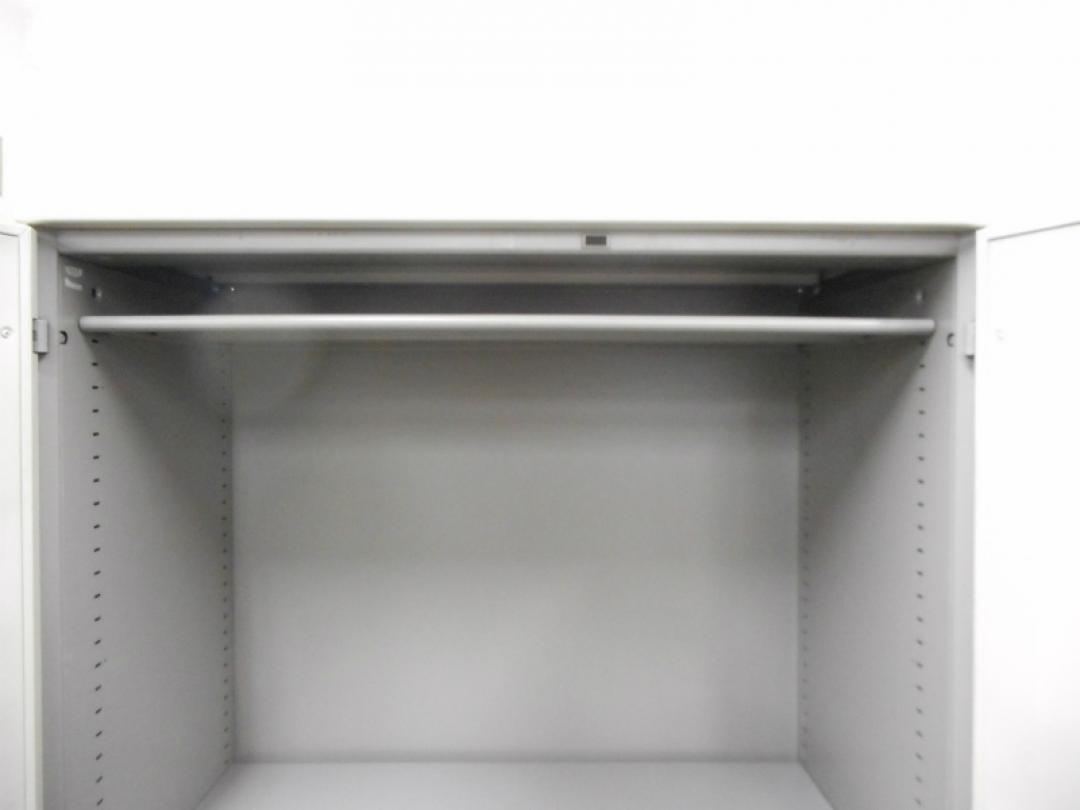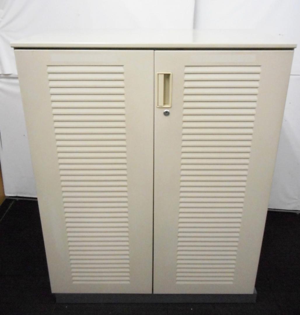 【状態良好】スチール製両開き書庫 棚板1枚 B4まで収納可能なトレーユニット付き 奥行500の深型タイプ 鍵付き ナチュラルグレー【中古オフィス家具】- 川崎店
