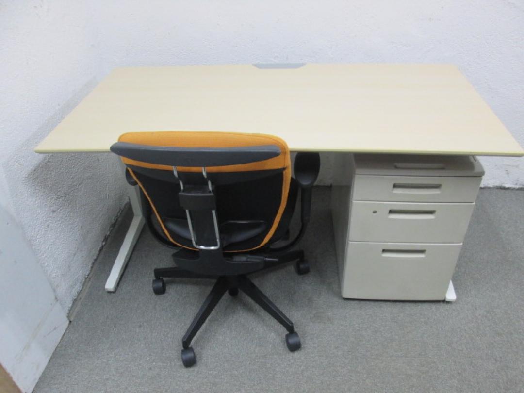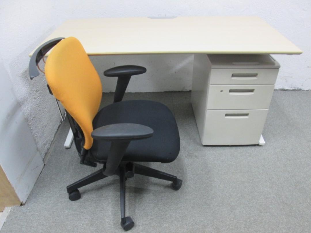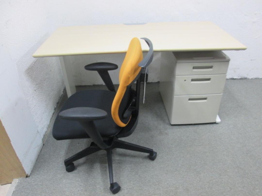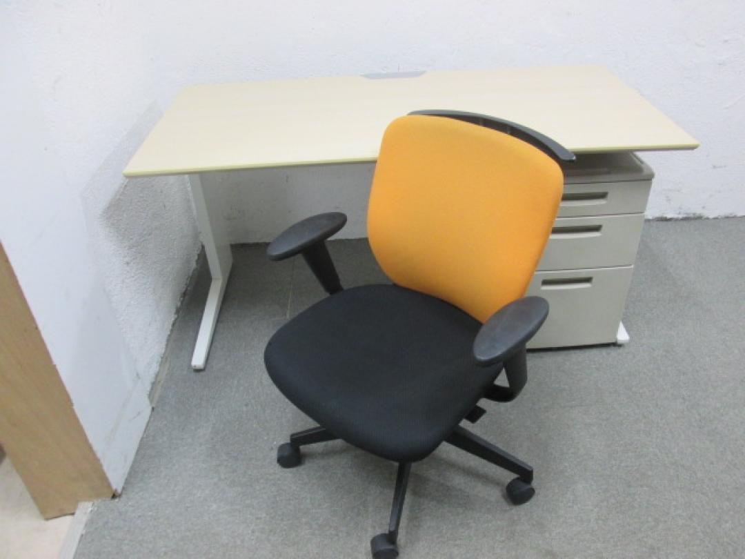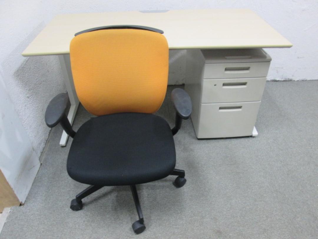 ●オカムラ製平机+イナバ製3段ワゴン+イトーキ製コートハンガー、肘付プラオチェア一式セット商品です。