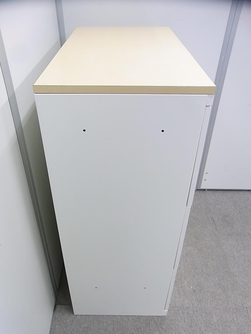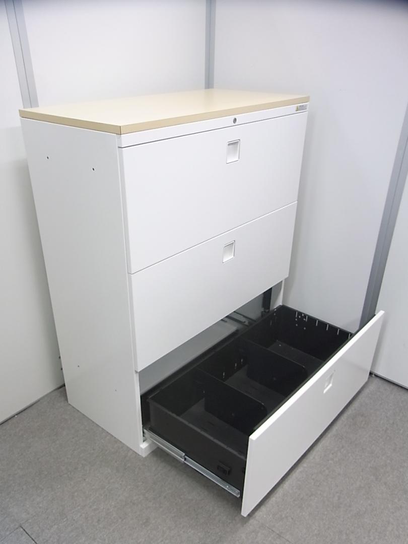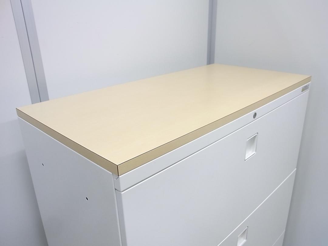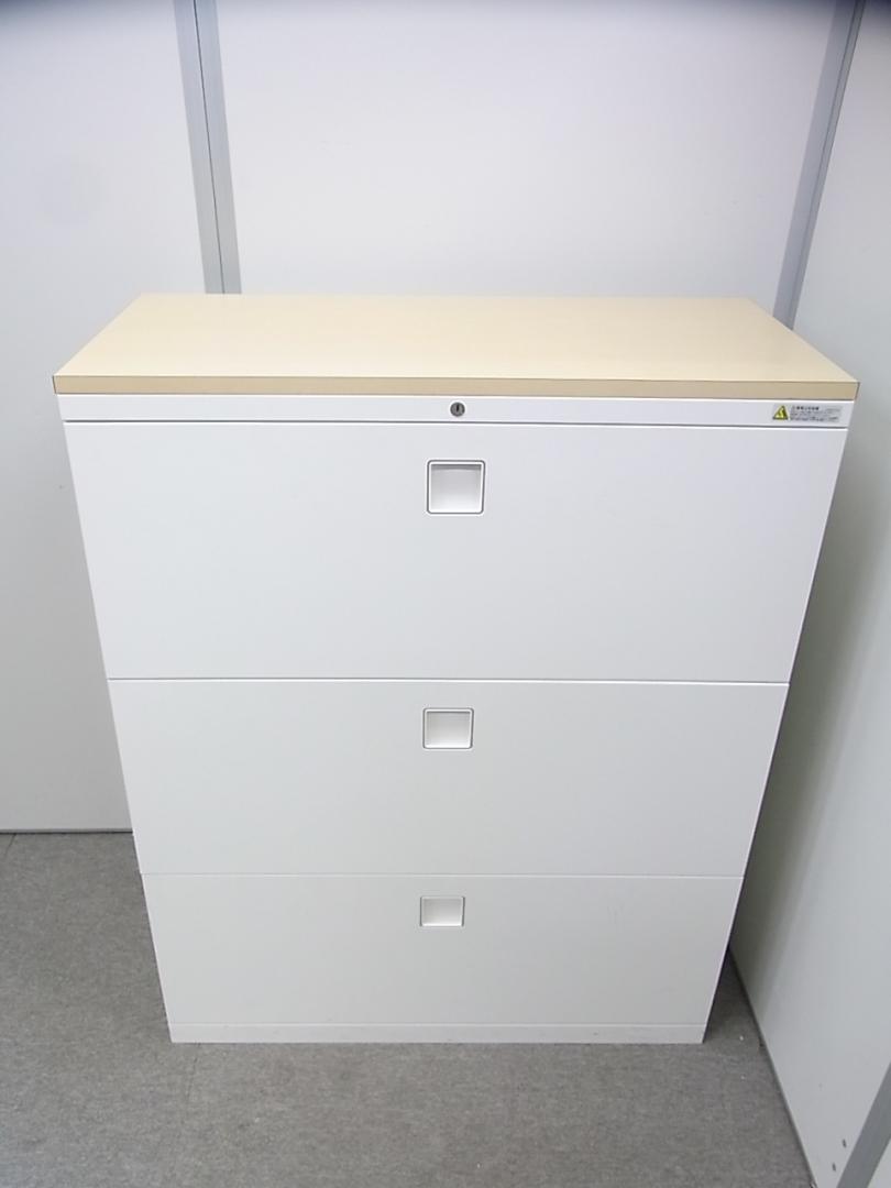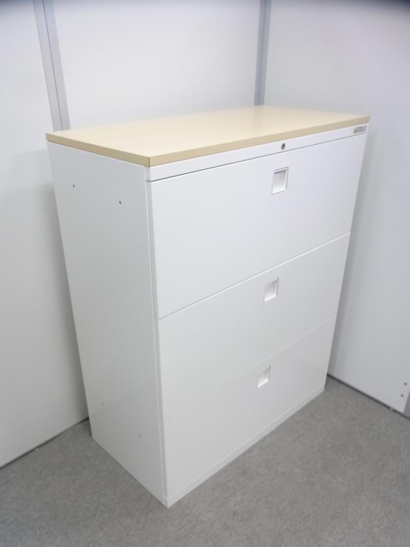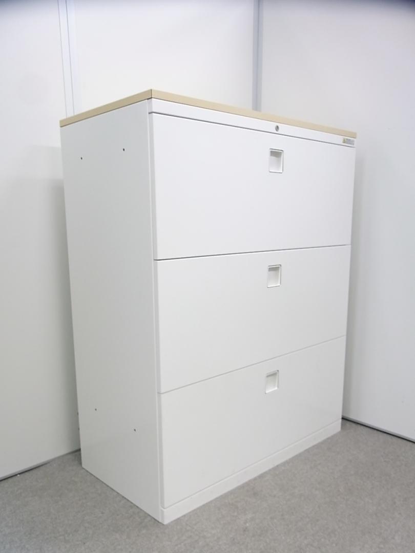 オカムラ レクトライン 3段ラテラル書庫 ホワイト天板 シリンダー錠 鍵付き ※取っ手部分に若干日焼けあり
