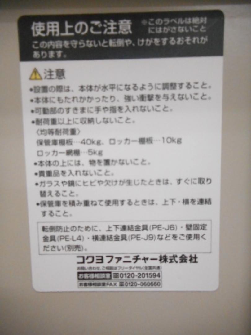 - 一部不具合ありそ引出の開閉不可、施錠不可、棚板無しといったの書庫の本来の効用を果たすための機能以外の一部が使用不可(例、扉、引出の開閉がしづらいなどがある。 )