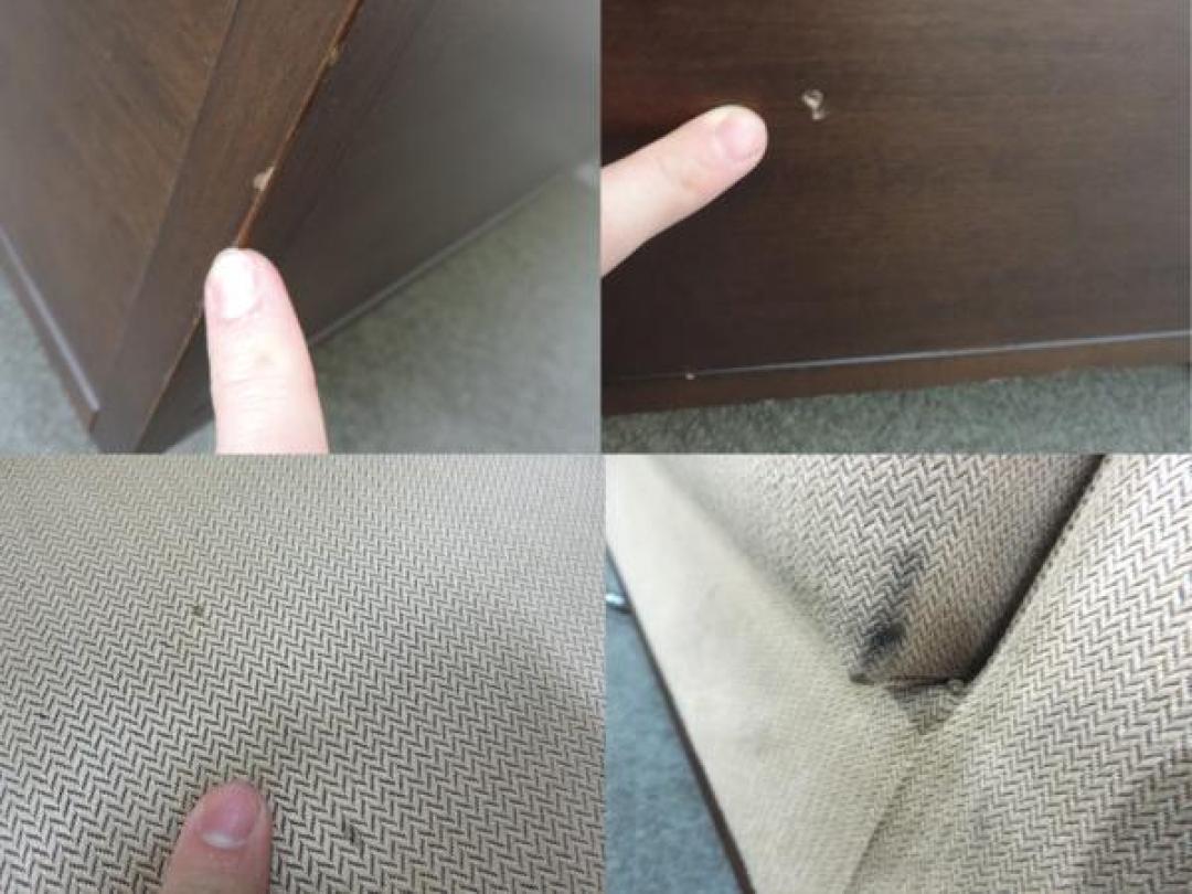 - 目立つ箇所複数あり深い傷・破れ・ほつれ・へたり・しわが商品全体にある。(例、座面・背もたれ、脚部等にある。)