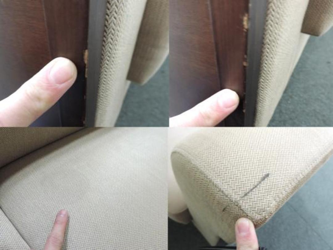 - 目立つ箇所複数あり深い傷・破れ・ほつれ・へたり・しわが商品全体にある。(例、座面・背もたれ、脚部等にある。)
