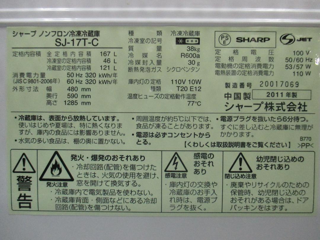 【中古】 SJ-17T-C シャープ/SHARP 冷蔵庫 130204