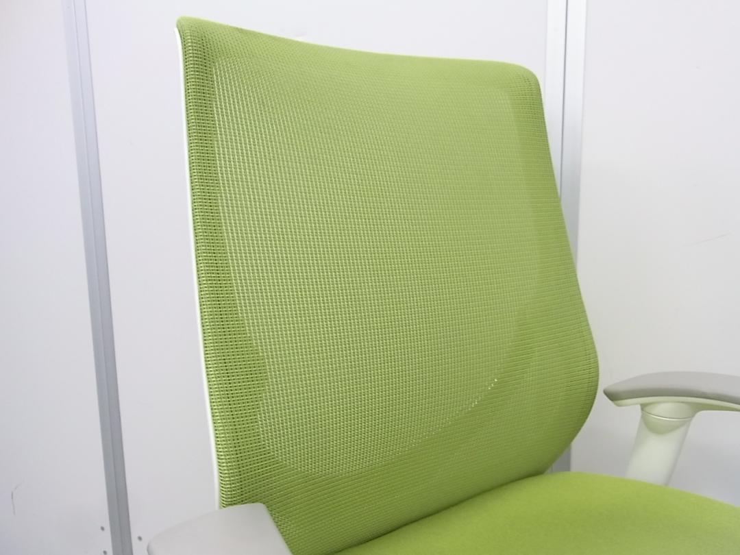 背もたれはメッシュで、フレームはホワイト、シートのカラーはグリーンです。
