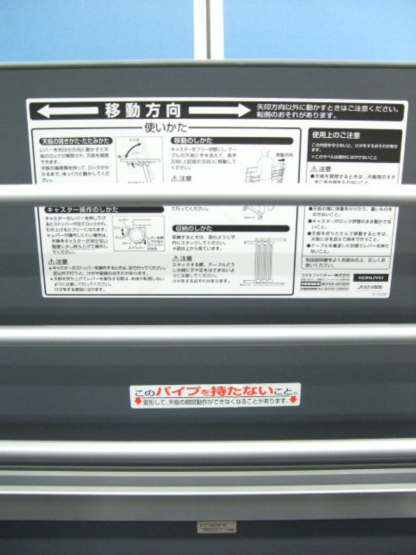 - 一部不具合あり天板歪み、アジャスター無し、キャスター使用不可ようなそのテーブルの本来の効用を果たすための機能以外の一部が使用不可な状態。(例、キャスターロッ ク機能使用不可、棚板無し等がある。)
