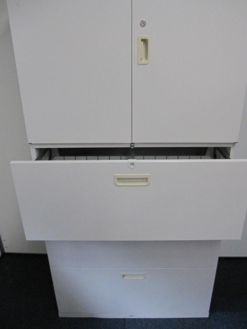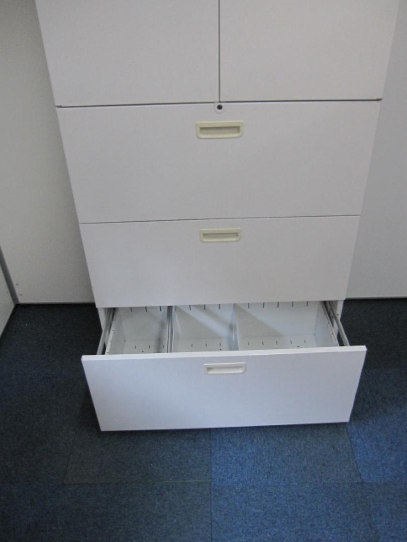 【オフィスキャビネット】上段:両開き(棚板:1枚)下段:3段ラテラル(引出)カラー:オフホワイト【オフィス家具】- 品川・三田店