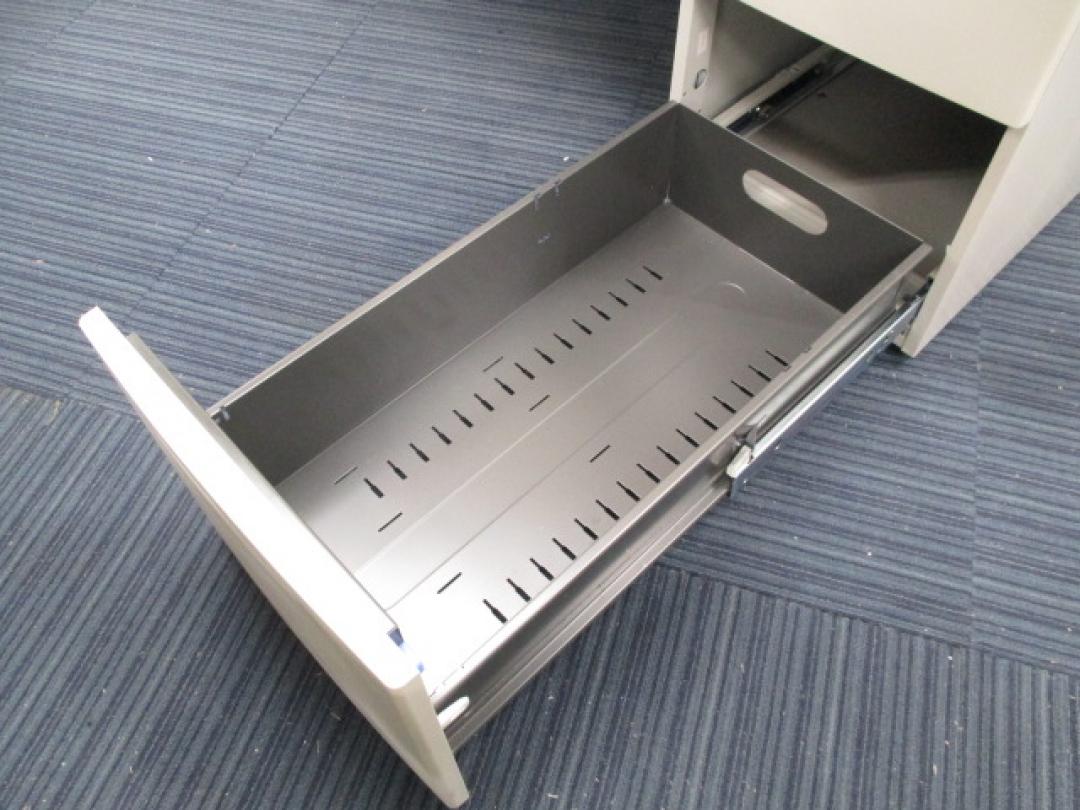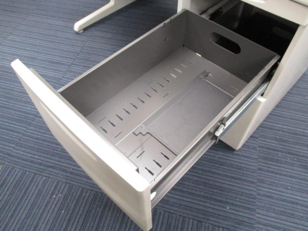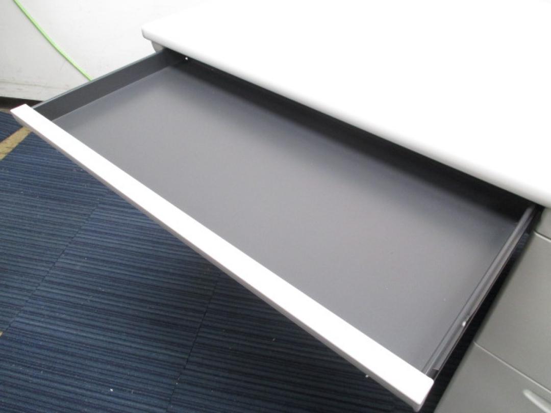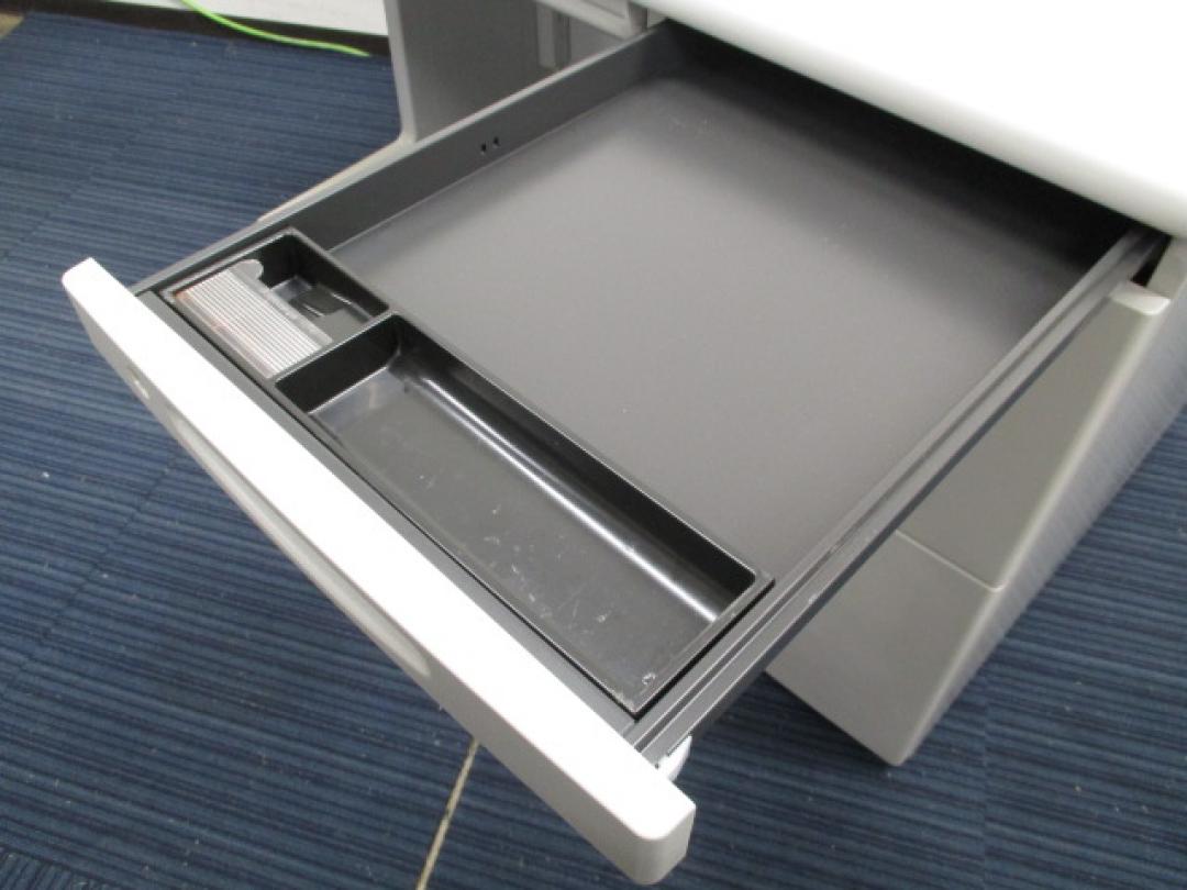 - 袖机のワゴンは、最下段がロング引出しになっており、従来より収納力120%アップ。