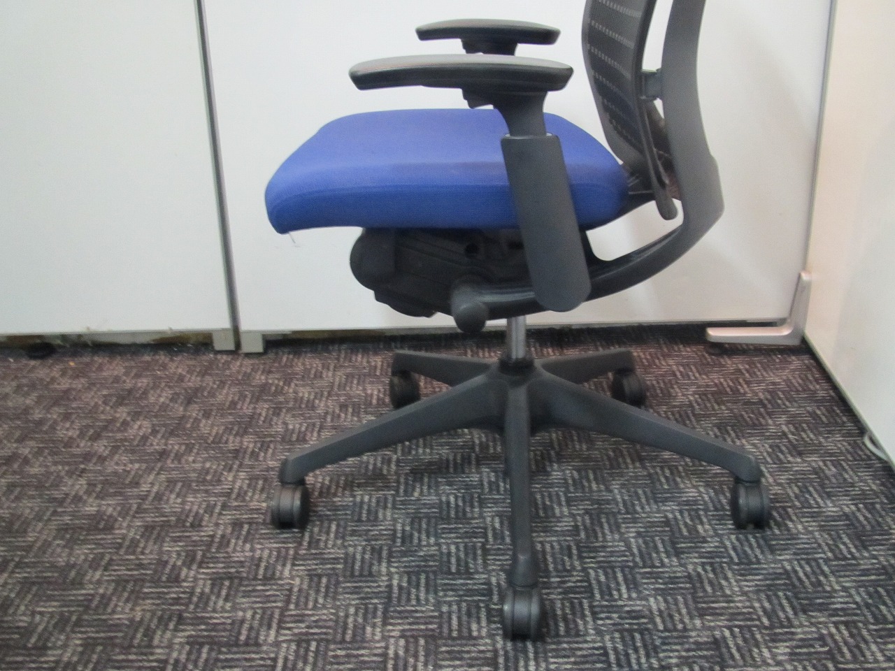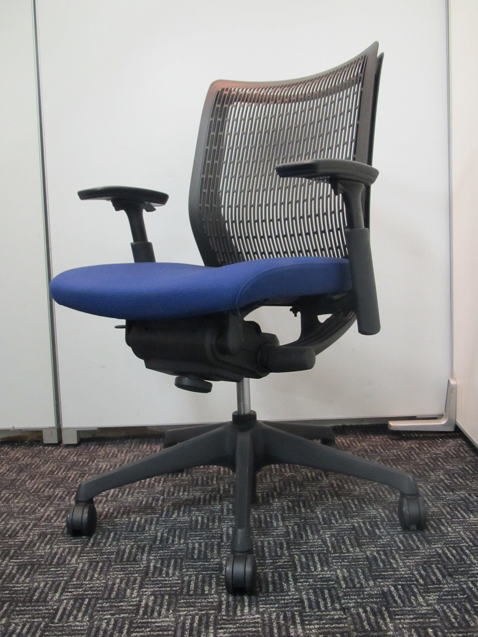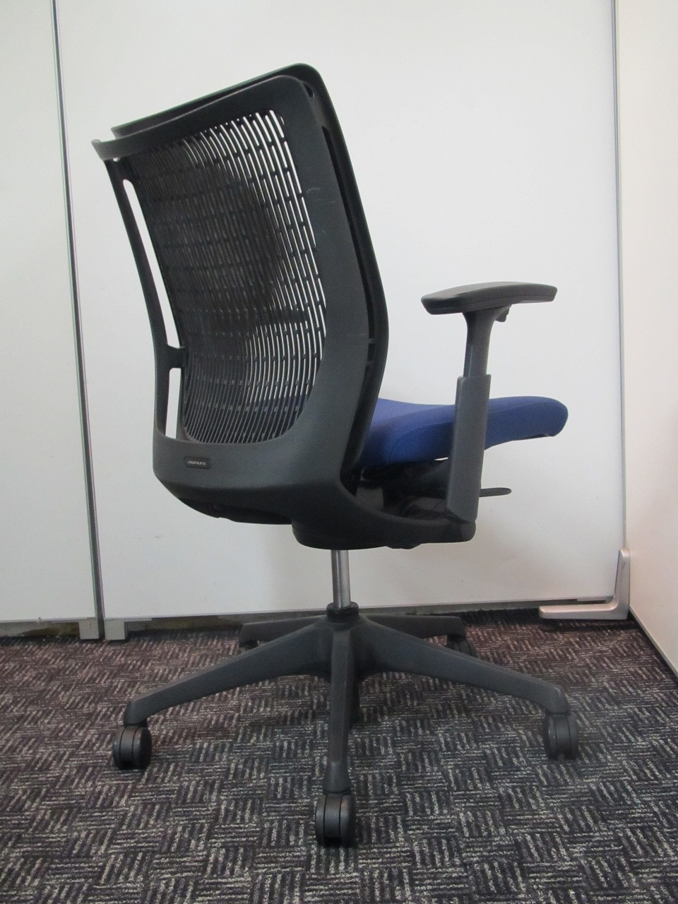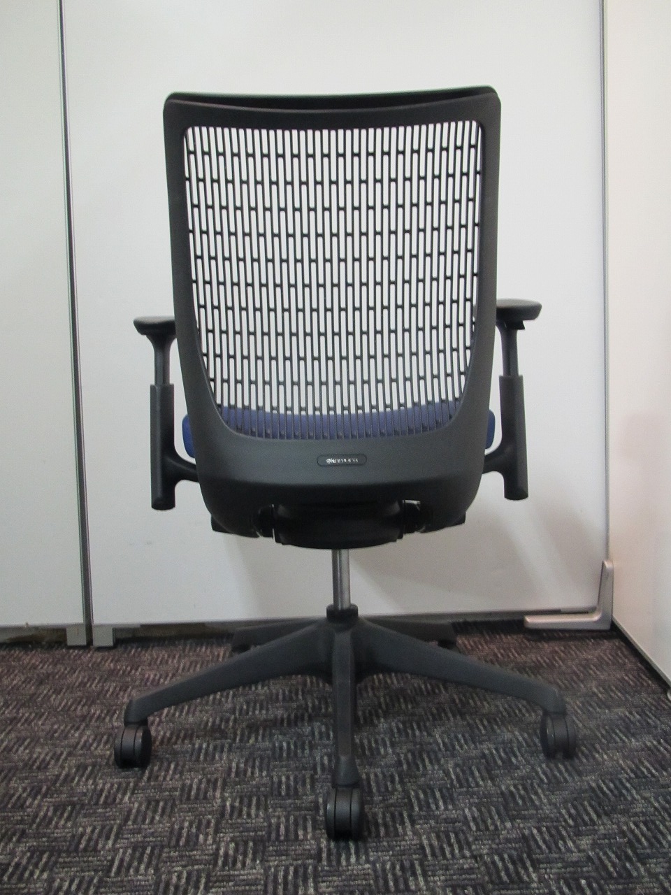 【人間工学に基づいた快適な座り心地!背によりかかるとバックシェルのグリッドが変形し、やさしくワーカーの身体を支えます!】■オカムラ(okamura)製 ヴィスコンテチェア (Visconte) 肘付きローバック ■固定肘 ■ミディアムブルー×ブラックシェル