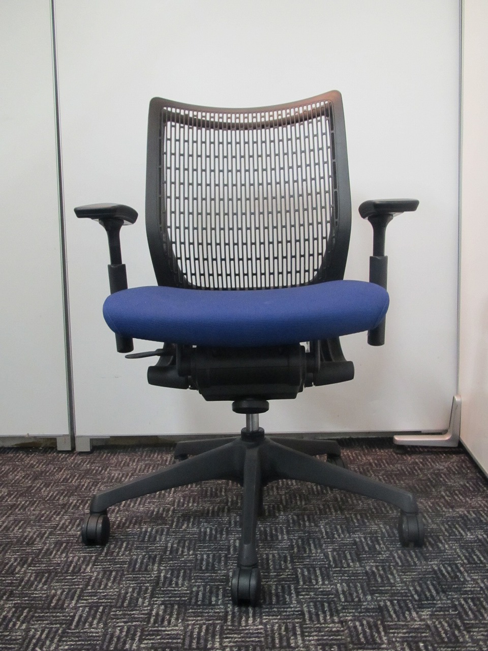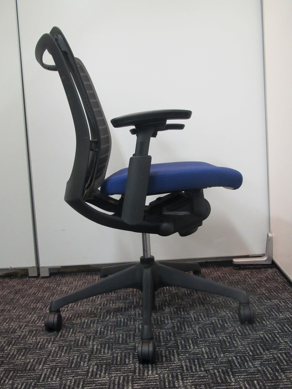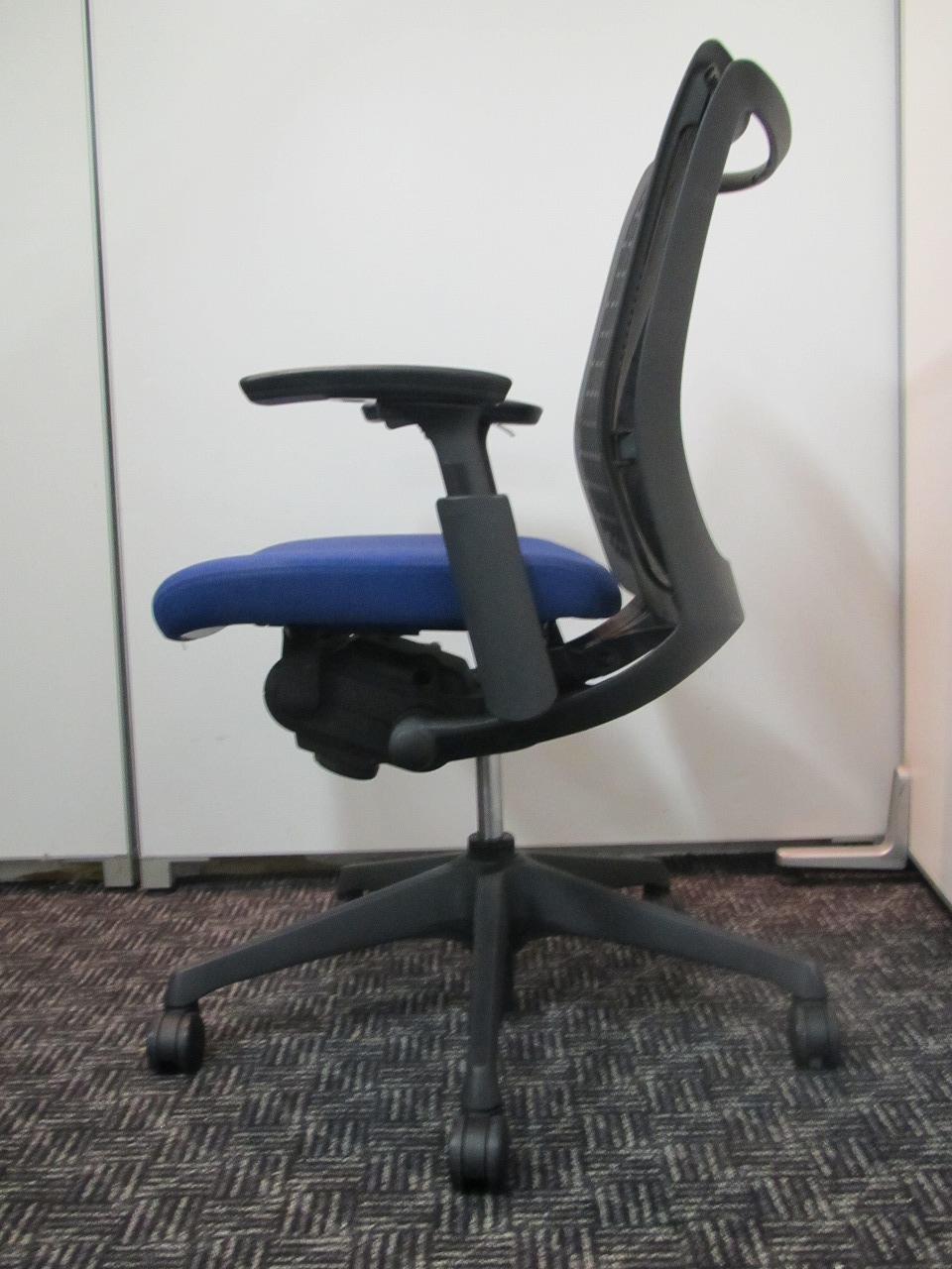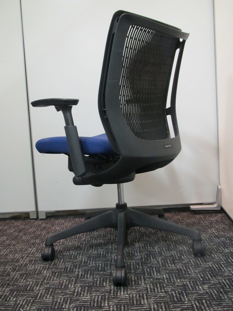 【人間工学に基づいた快適な座り心地!背によりかかるとバックシェルのグリッドが変形し、やさしくワーカーの身体を支えます!】■オカムラ(okamura)製 ヴィスコンテチェア (Visconte) 肘付きローバック ■固定肘 ■ミディアムブルー×ブラックシェル