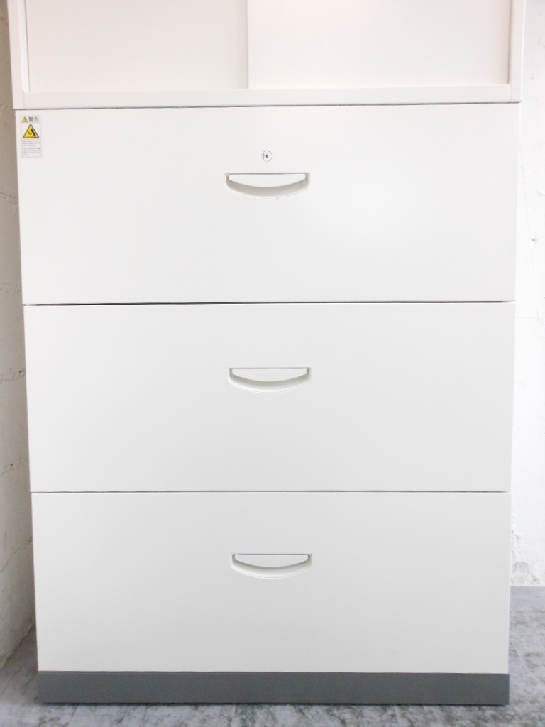 下置きは3段ラテラルキャビネットで重たいファイルなどの