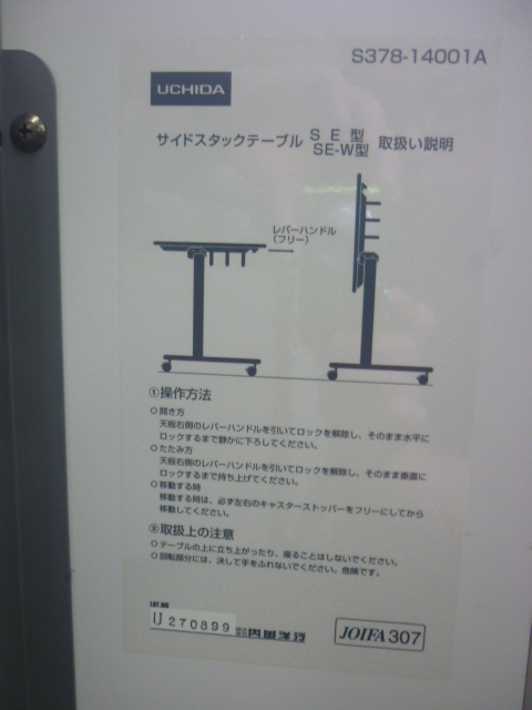 - 一部不具合あり天板歪み、アジャスター無し、キャスター使用不可ようなそのテーブルの本来の効用を果たすための機能以外の一部が使用不可な状態。(例、キャスターロッ ク機能使用不可、棚板無し等がある。)