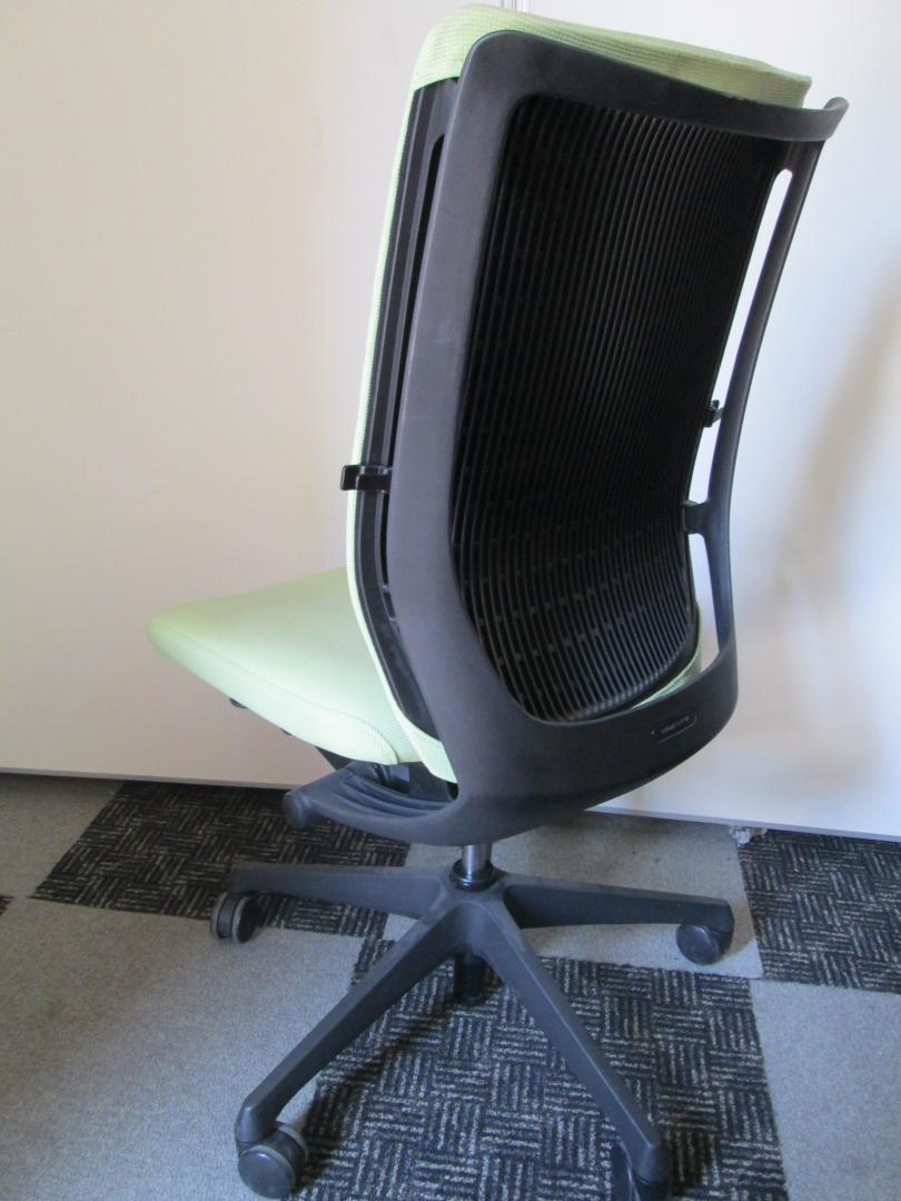 オカムラ製ヴィスコンテシリーズの肘無ハイバックチェアになります。明るいライトグリーン