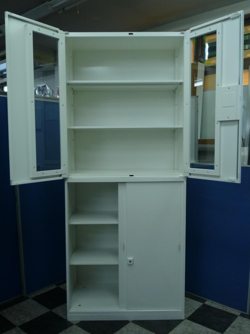 上段の両開き書庫は戸を開けばすぐ全体を見渡せるという利点がありますが、