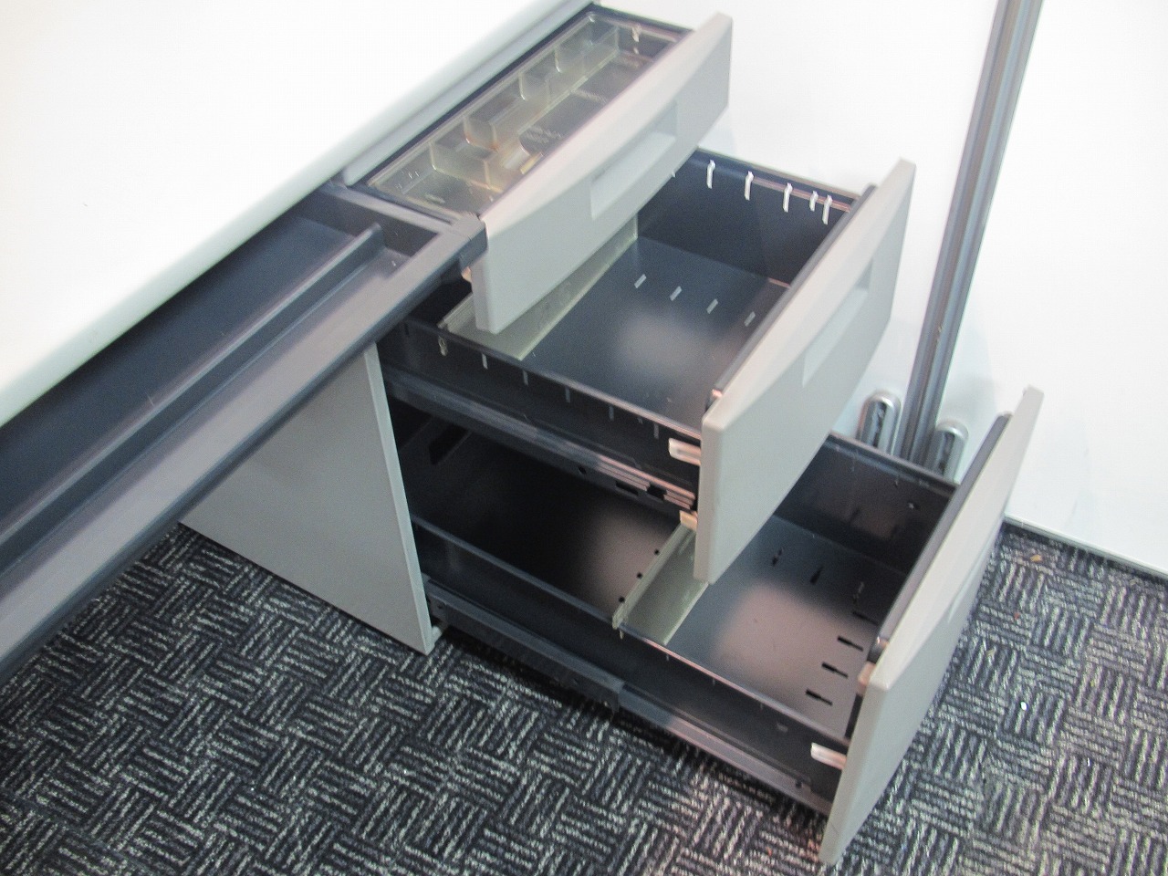 - 基本的なPCデスクの機能を有するコスパの良いシリーズ。収納力や引出しのロック機能などの安全機能も備えています。