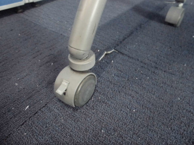 - 一部不具合あり天板歪み、アジャスター無し、キャスター使用不可ようなそのテーブルの本来の効用を果たすための機能以外の一部が使用不可な状態。(例、キャスターロッ ク機能使用不可、棚板無し等がある。)