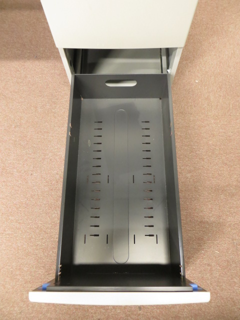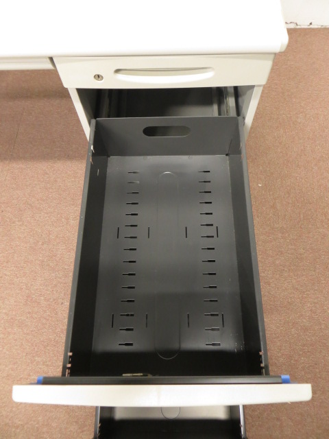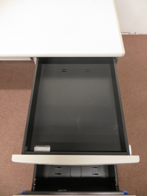 - 袖机のワゴンは、最下段がロング引出しになっており、従来より収納力120%アップ。