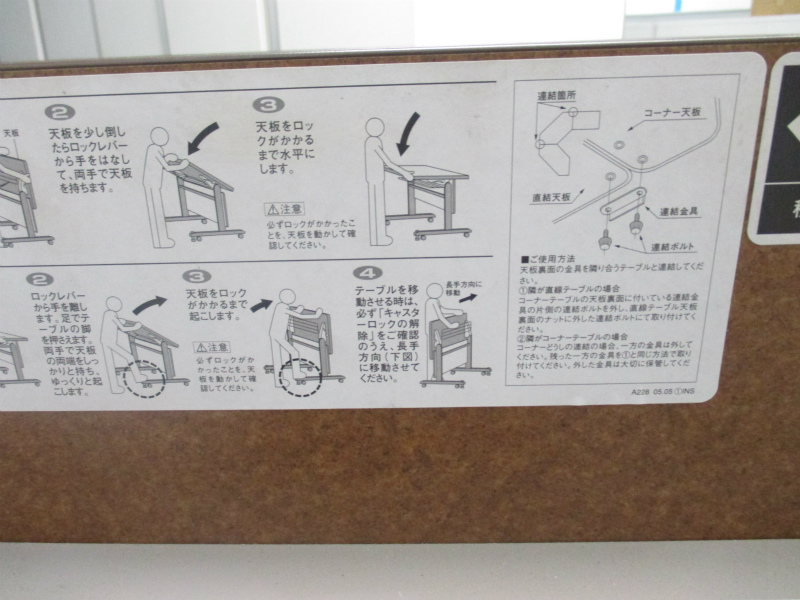 - 一部不具合あり天板歪み、アジャスター無し、キャスター使用不可ようなそのテーブルの本来の効用を果たすための機能以外の一部が使用不可な状態。(例、キャスターロッ ク機能使用不可、棚板無し等がある。)