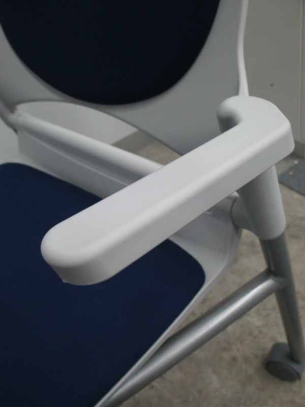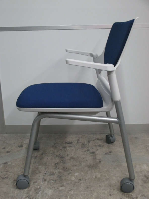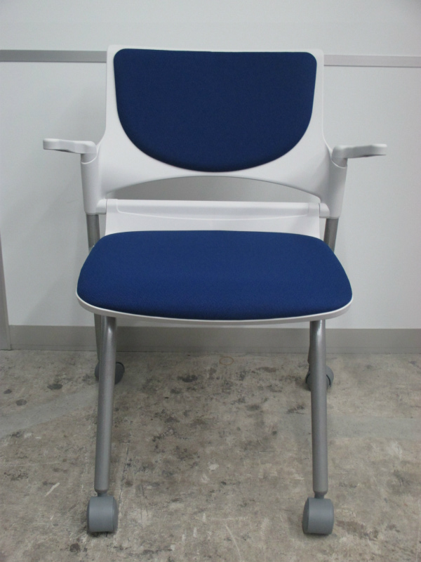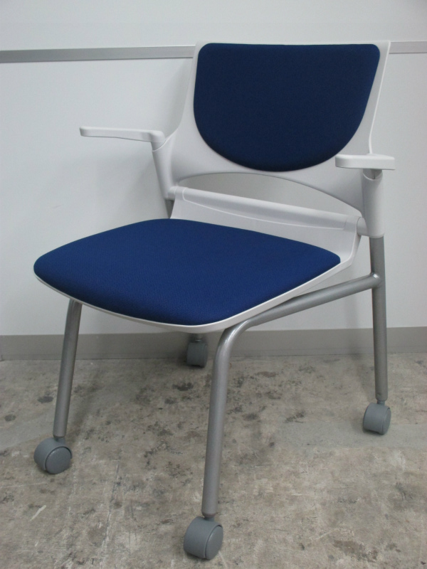 【セット商品、状態良好!】イナバ製ネスティングチェア 肘付き キャスター付き 4脚セット ブルーカラー【中古オフィス家具】- 川崎店