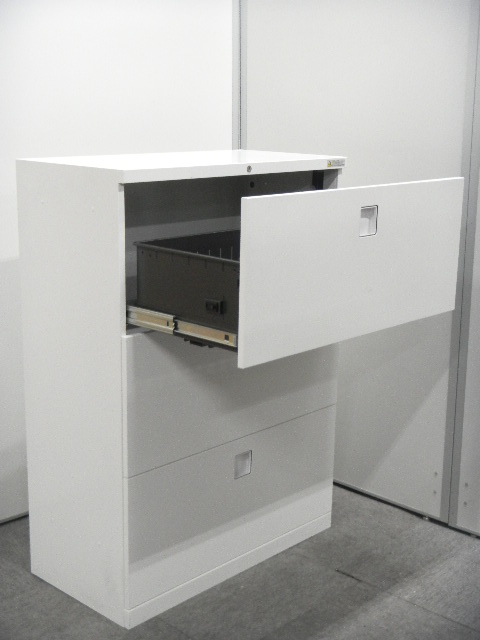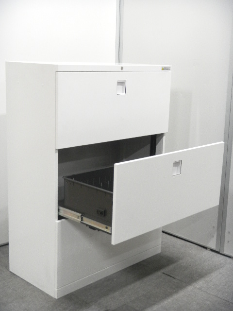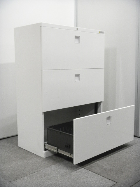 【オフィスの必需品!大容量の三段キャビネット!】■オカムラ(okamura)製 レクトラインシリーズ 3段ラテラル ローキャビネット ■ベース付 ■シリンダー錠 ■ホワイト 【弊社使用欄:A01037187】