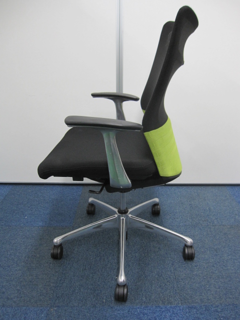 【人間工学に基づいた快適な座り心地! 背あてのしなやかな曲線が背中にフィット!】■オカムラ製 フィーゴチェア (feego) 肘付ハイバック シームレスタイプ ■肘付 ■ブラック×グリーン ■固定肘