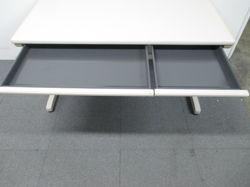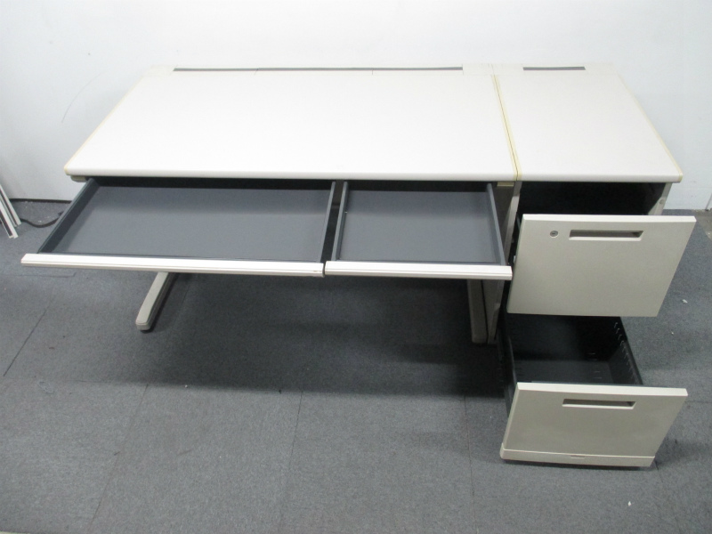 ワゴンを入れて片袖机にもなり、元々平デスクにも引き出しがついておりますので、