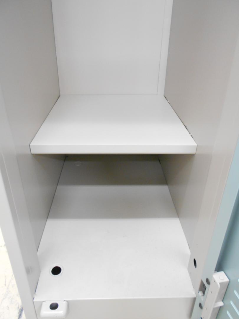 淡い青の扉の3人用ロッカーで、堅すぎる印象にならず