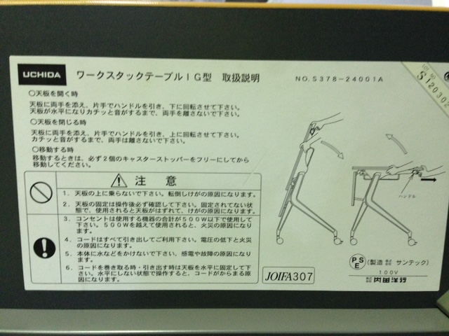- 一部不具合あり天板歪み、アジャスター無し、キャスター使用不可ようなそのテーブルの本来の効用を果たすための機能以外の一部が使用不可な状態。(例、キャスターロッ ク機能使用不可、棚板無し等がある。)