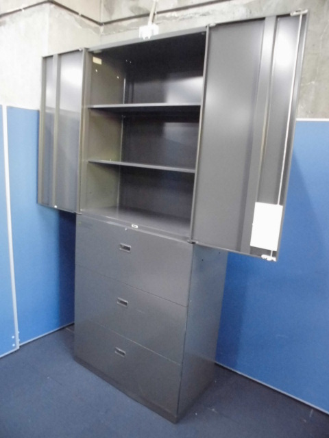 【珍しいブラック】内田洋行|上下書庫セット|3段ラテラル+両開き(観音開き)【鍵付】- 立川・八王子店