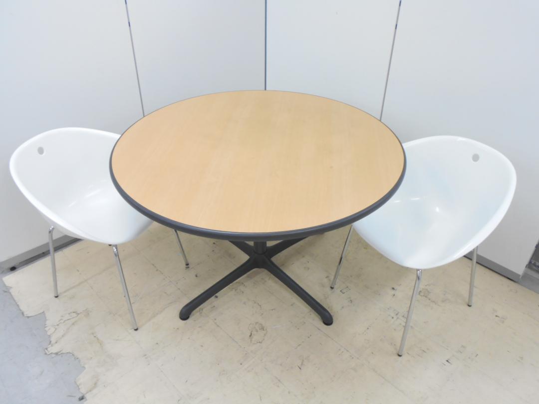 ナチュラル天板のラウンドテーブルにこぼっとしたデザインチェアをセットしました。