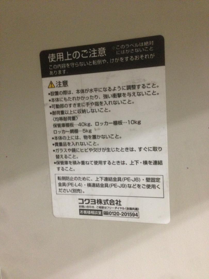 - 一部不具合ありそ引出の開閉不可、施錠不可、棚板無しといったの書庫の本来の効用を果たすための機能以外の一部が使用不可(例、扉、引出の開閉がしづらいなどがある。 )