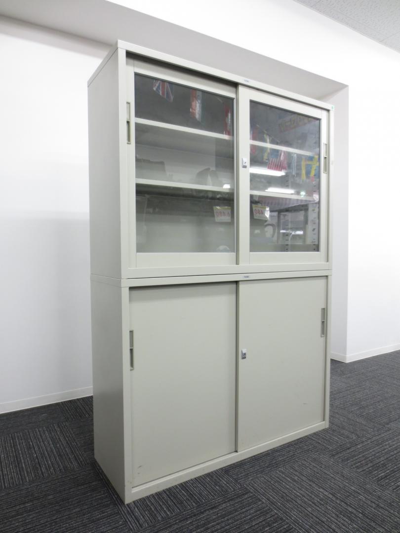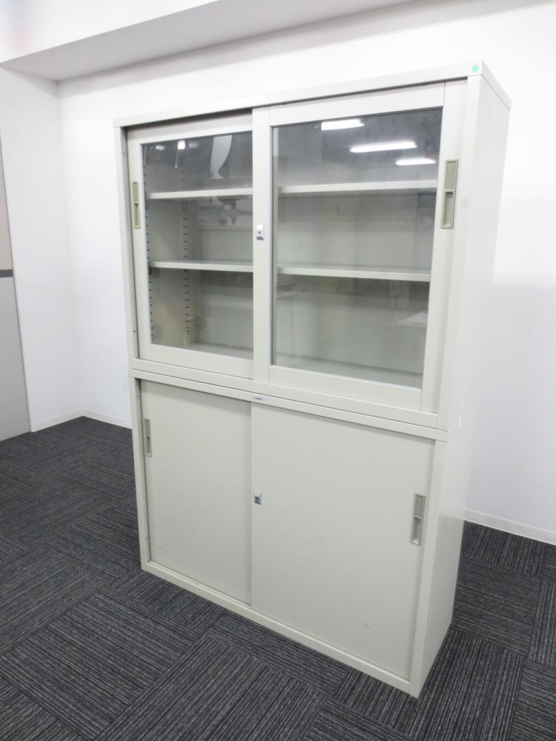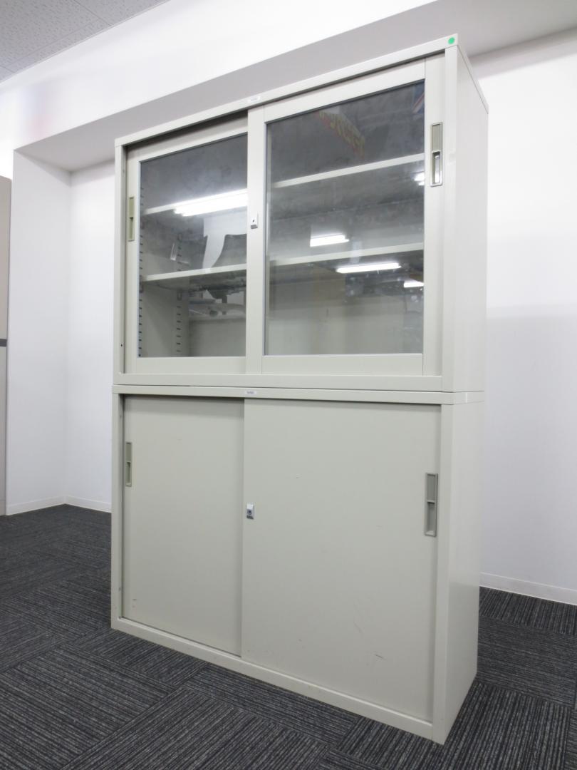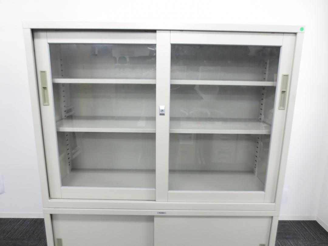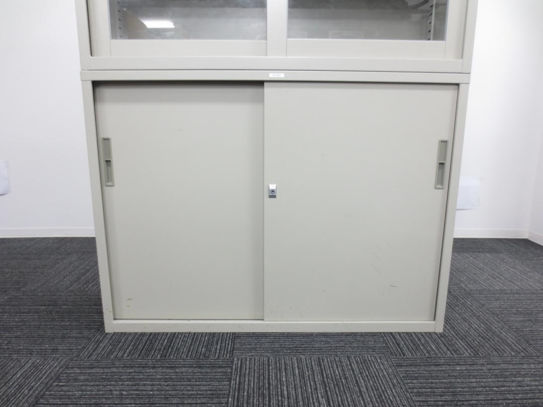 【鍵付き】【希少品】■上下引違い書庫セット ■ナイキ製 ■ニューグレー ■幅:1200奥行400高さ1760 【上置:ガラス引戸】【下置:スチール引戸】- 春日部・越谷店
