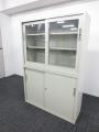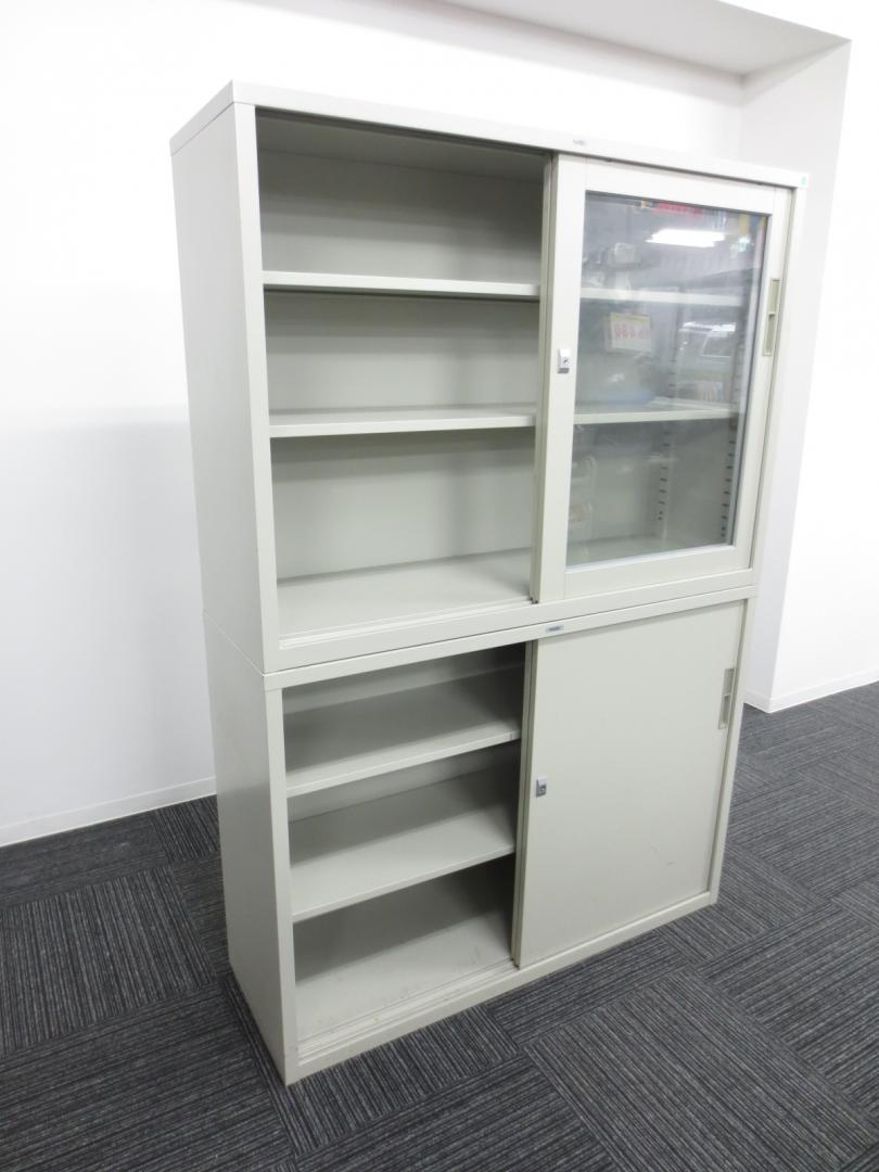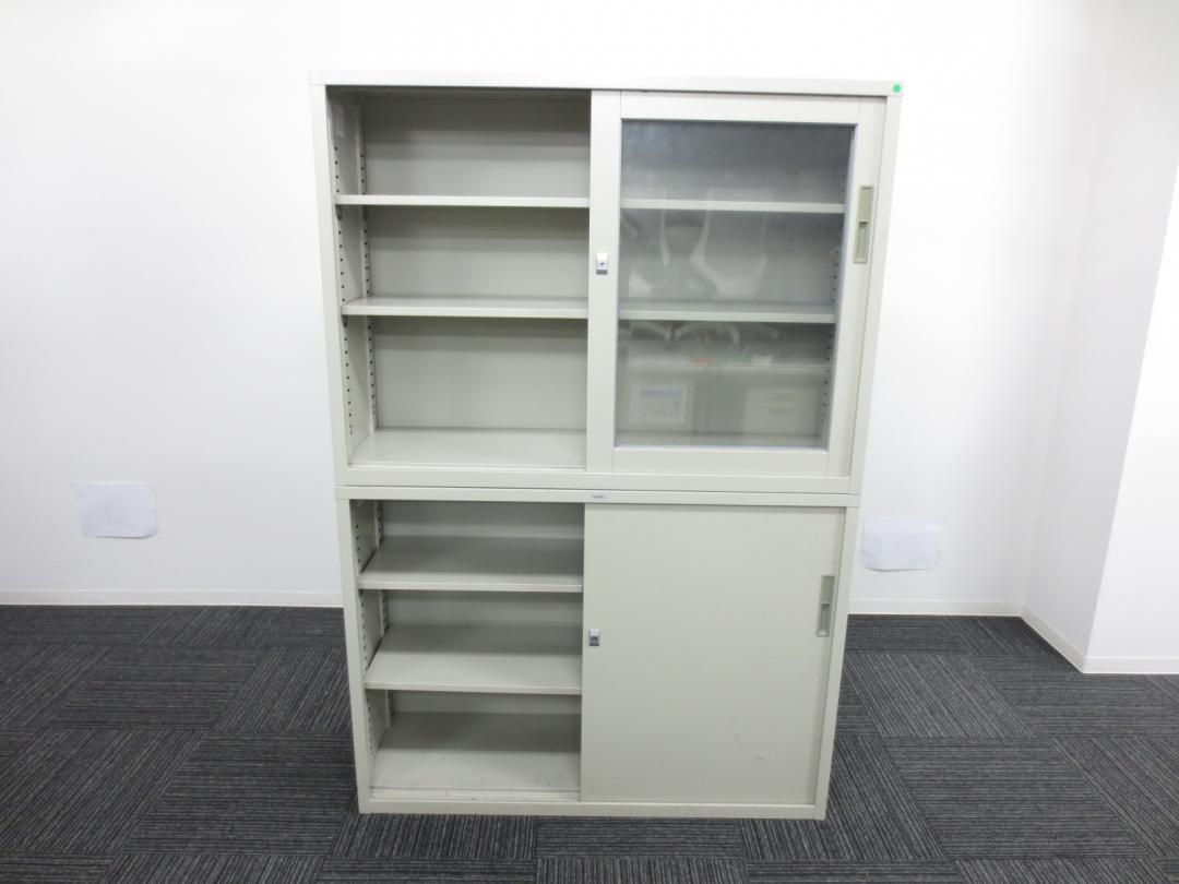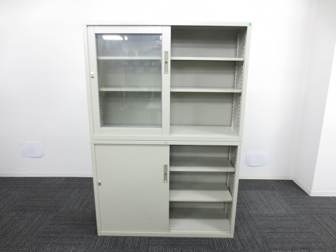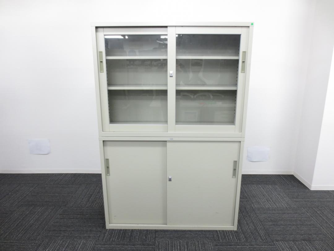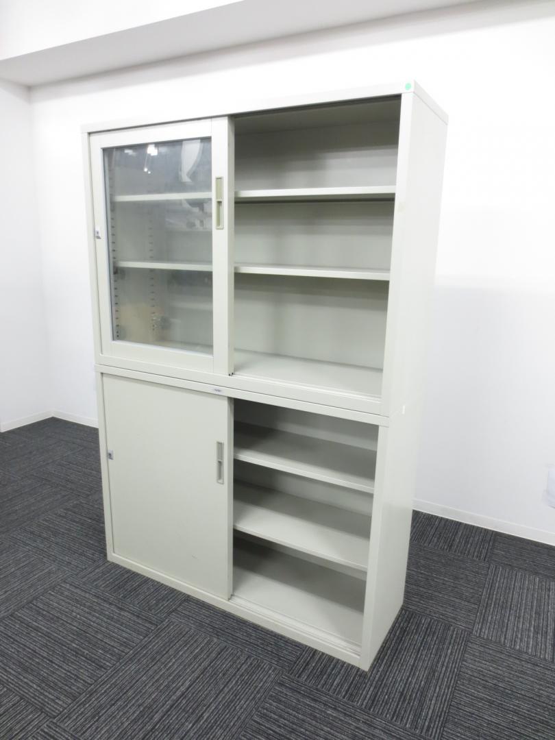 【鍵付き】【希少品】■上下引違い書庫セット ■ナイキ製 ■ニューグレー ■幅:1200奥行400高さ1760 【上置:ガラス引戸】【下置:スチール引戸】- 春日部・越谷店