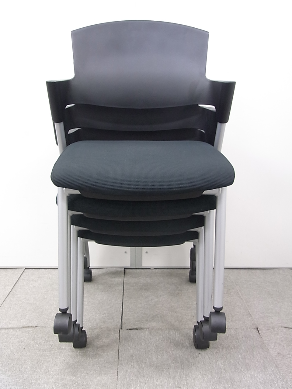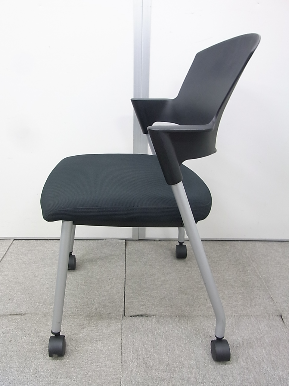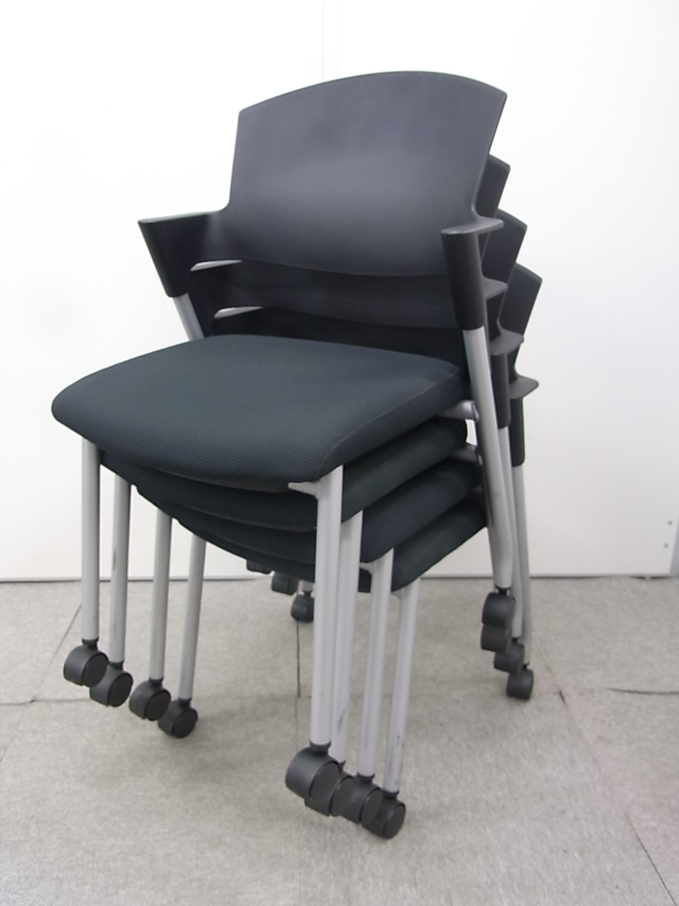 【シンプルスマートなスタッキングチェア!分厚いクッションで長時間でも快適な座り心地!】■スタッキングチェア 肘付ミーティングチェア ■固定肘 ■キャスター付 ■ブラック ■背面樹脂/コクヨ(KOKUYO/プロッティ