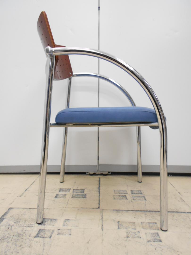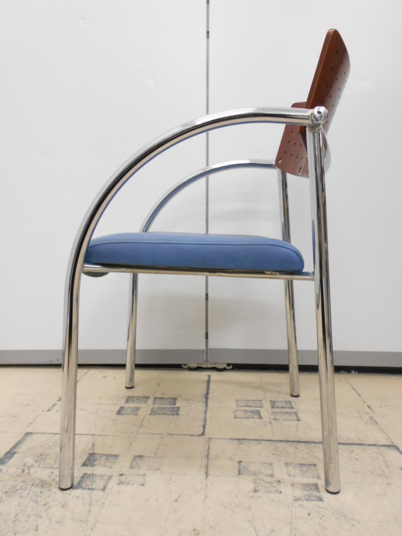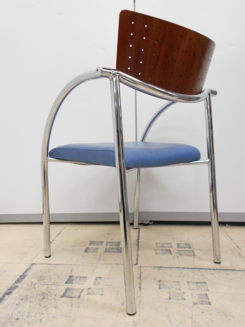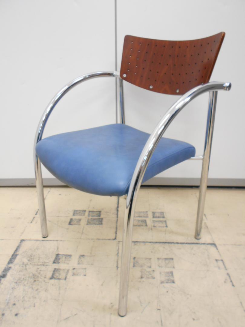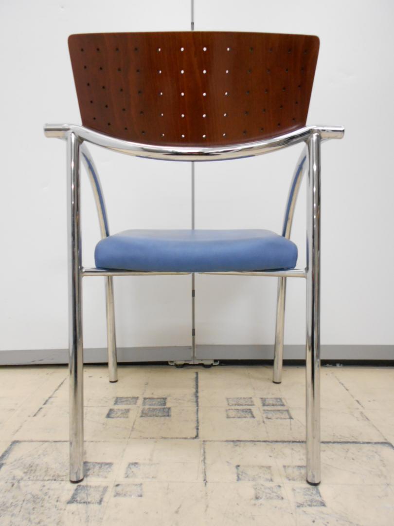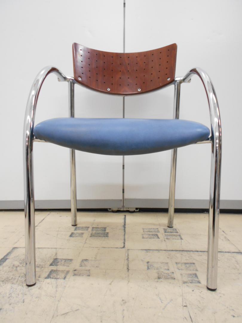 木製の背当てと鮮やかなブルーの座面が印象的なスタッキングチェアです。
