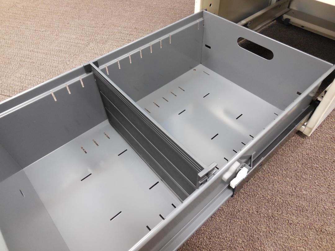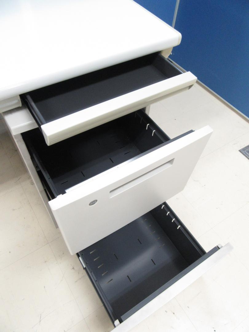 - 袖机のワゴンは、最下段がロング引出しになっており、従来より収納力120%アップ。