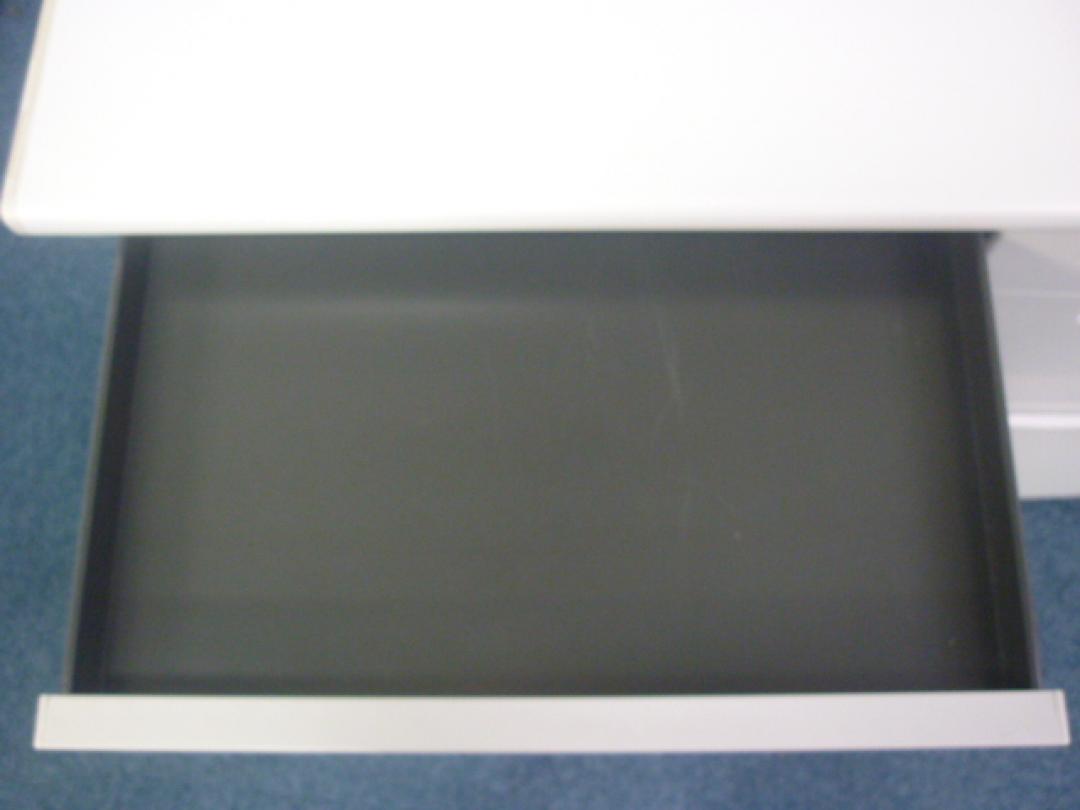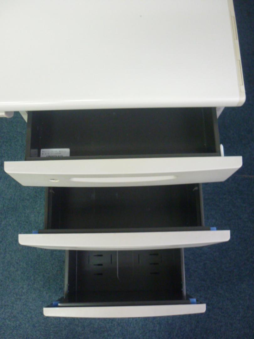 - 袖机のワゴンは、最下段がロング引出しになっており、従来より収納力120%アップ。