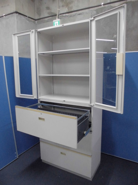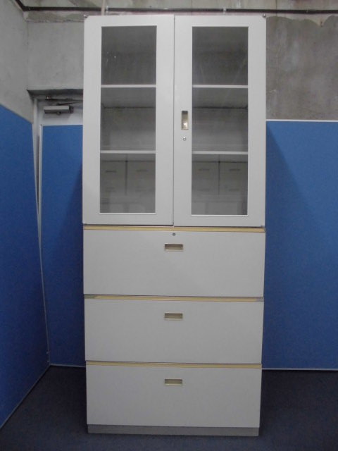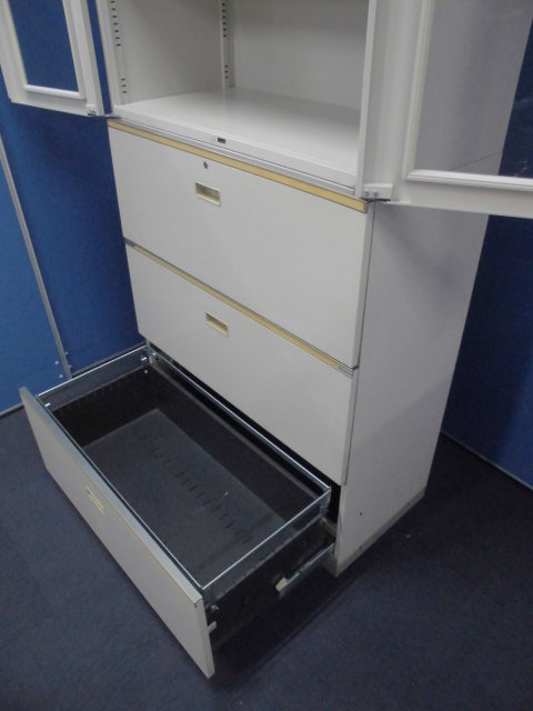 上のガラス戸は中身が確認しやすく、下の3段ラテラルは重量物も収納できます!