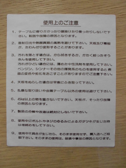 - 壊れている天板歪み、アジャスター無し、キャスター使用不可のようにそのテーブルの本来の効用を果たすための機能に不具合がある。