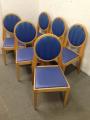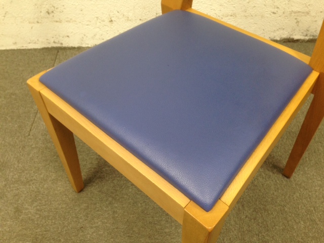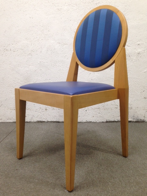落ち着いた木製と明るいブルーの背もたれと座面が