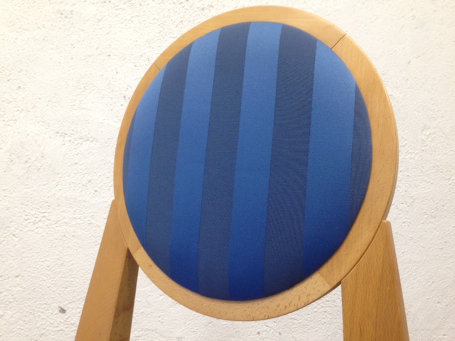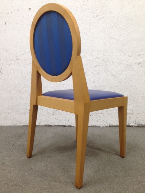 落ち着いた木製と明るいブルーの背もたれと座面が