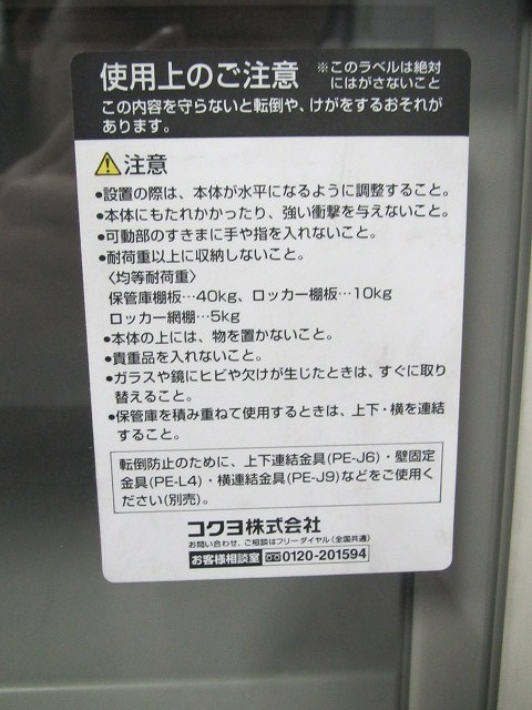 - 一部不具合ありそ引出の開閉不可、施錠不可、棚板無しといったの書庫の本来の効用を果たすための機能以外の一部が使用不可(例、扉、引出の開閉がしづらいなどがある。 )