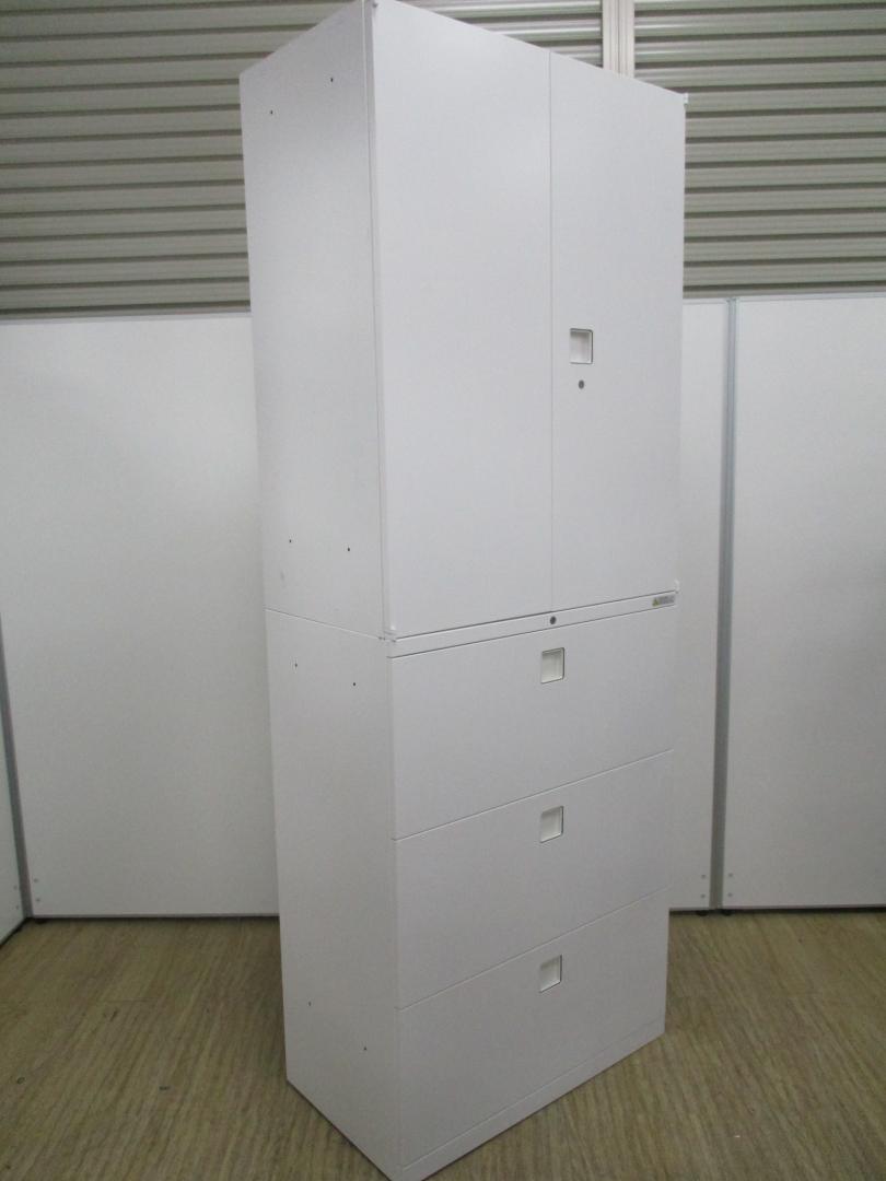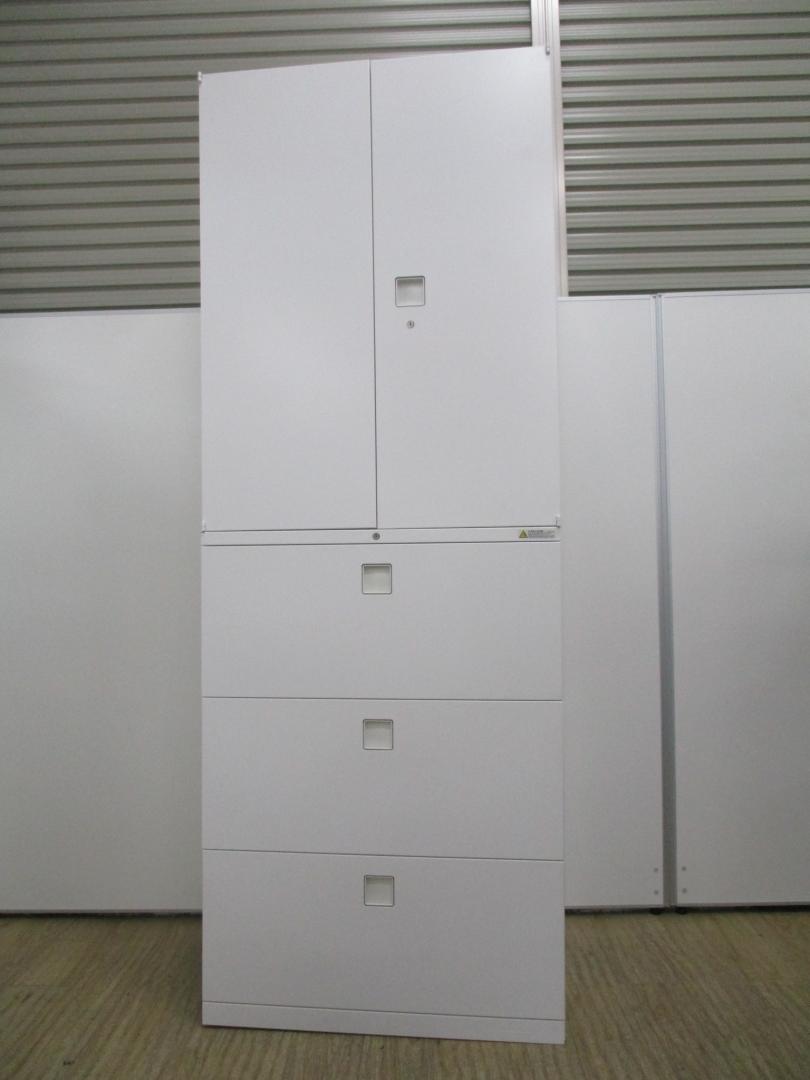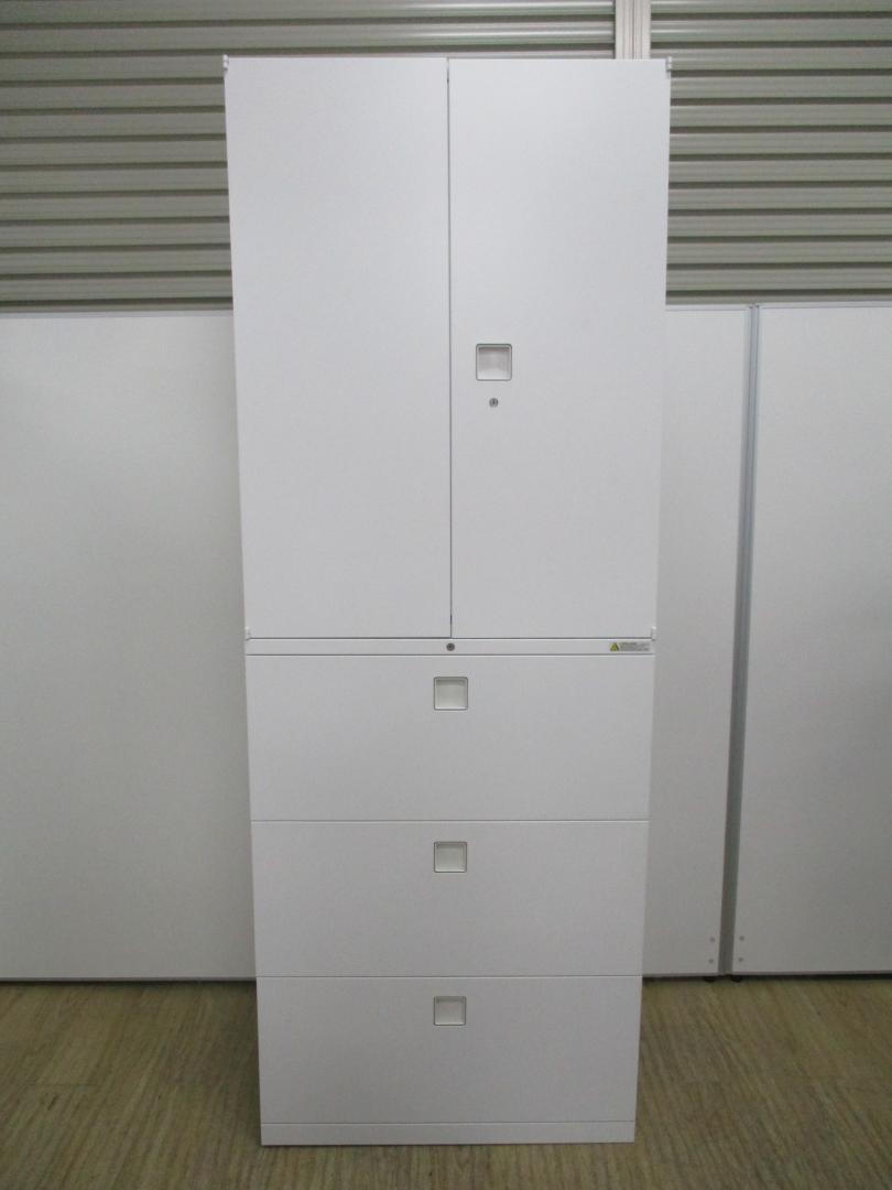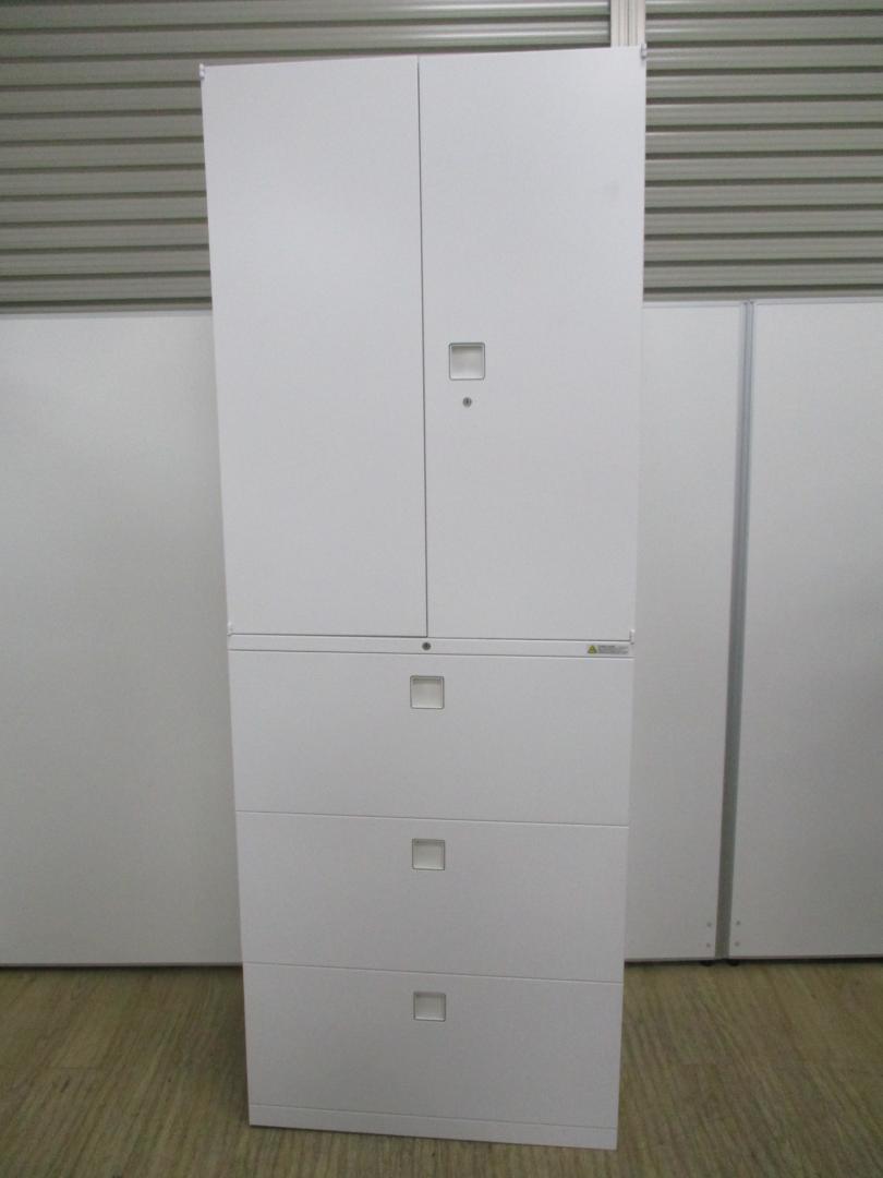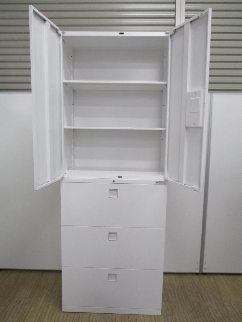 スライド式の扉+引き出しタイプの便利な書庫セットが入荷!使い勝手抜群のハイキャビネットが入荷! ■オカムラ/レクトライン/ホワイト 2枚引き戸+3段ラテラルキャビネット